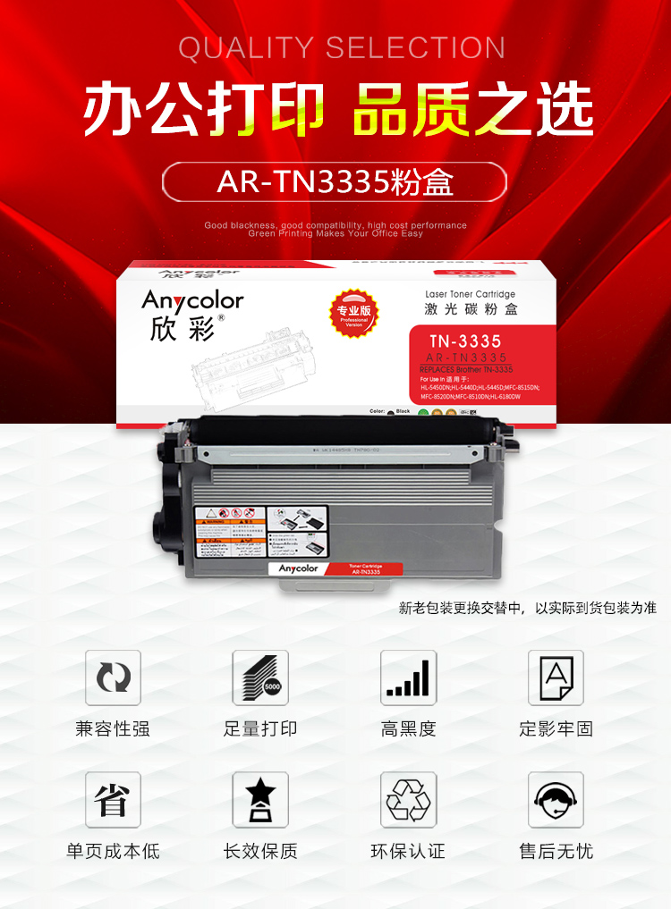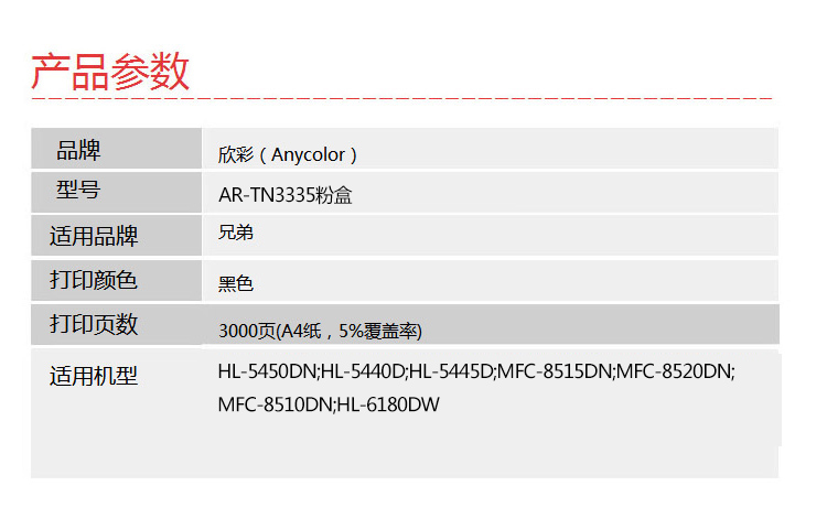 欣彩(Anycolor) AR-TN3335 3000页 适用兄弟HL-5440D 5445D 粉盒 1.00 只/支 (计价单位:支) 黑色