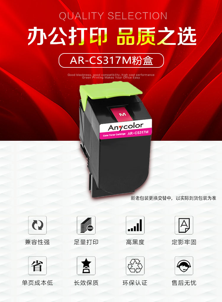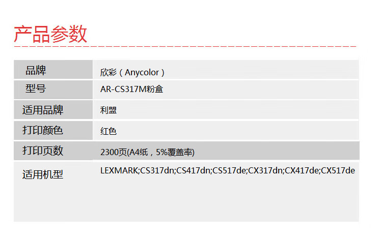 欣彩(Anycolor) AR-CS317M 2300页 适用利盟LEXMARK CS317dn 粉盒 1.00 只/支 (计价单位:支) 红色
