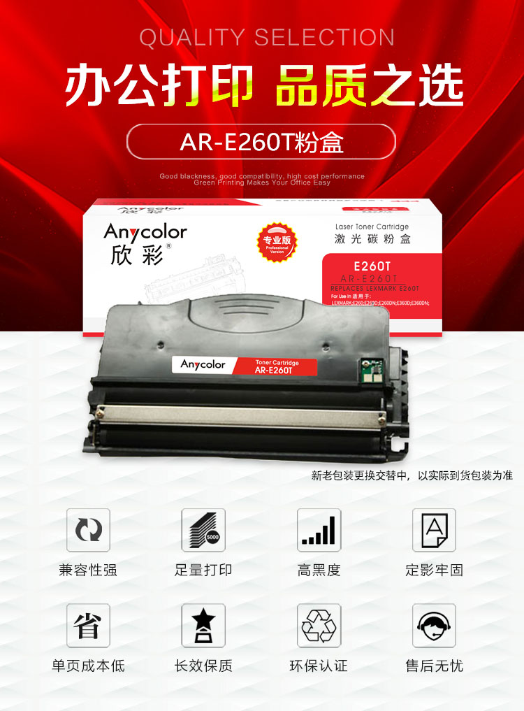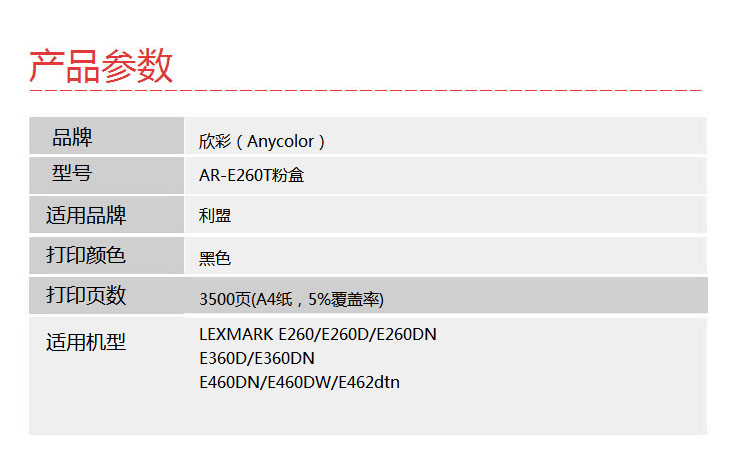 欣彩(Anycolor) AR-E260T 3500页 适用利盟E260 A21P 粉盒 1.00 只/支 (计价单位:支) 黑色