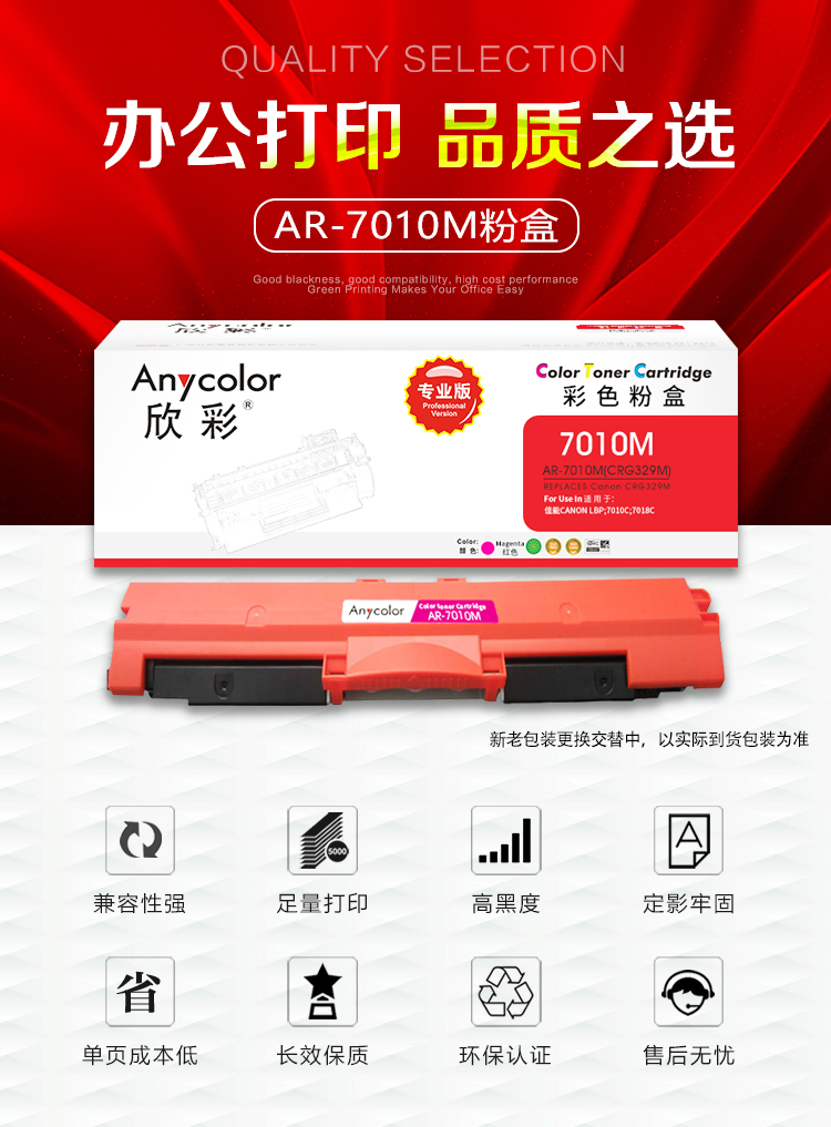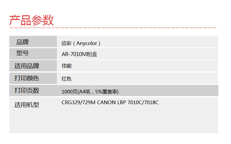 欣彩(Anycolor) AR-7010M 专业版 1000页 适用佳能CRG729M 粉盒 1.00 只/支 (计价单位:支) 红色