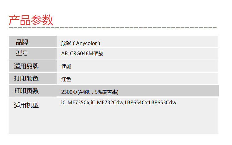 欣彩(Anycolor) AR-CRG046M 专业版 2300页 适用佳能732Cdw 硒鼓 1.00 只/支 (计价单位:支) 红色