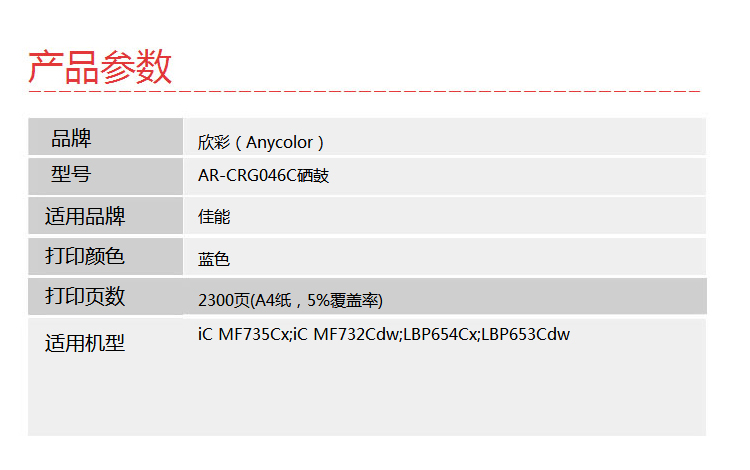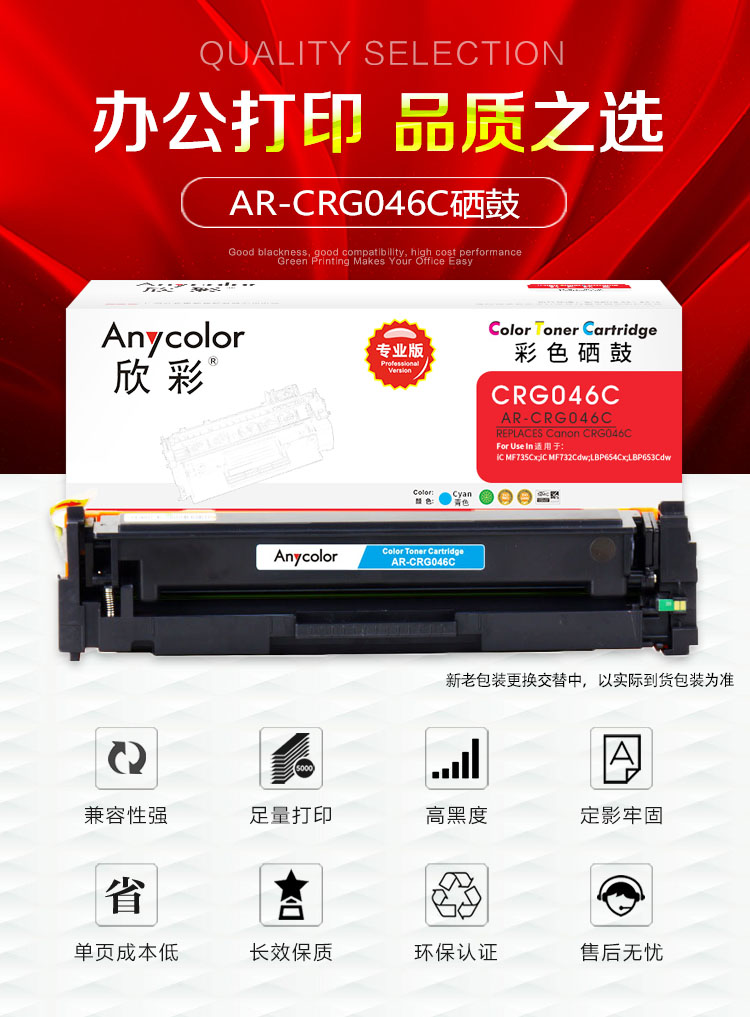 欣彩(Anycolor) AR-CRG046C 专业版 2300页 适用佳能732Cdw 硒鼓 1.00 只/支 (计价单位:支) 蓝色