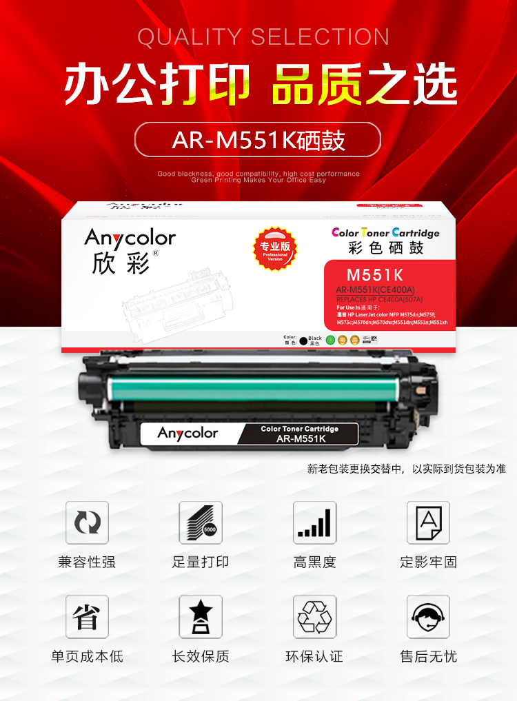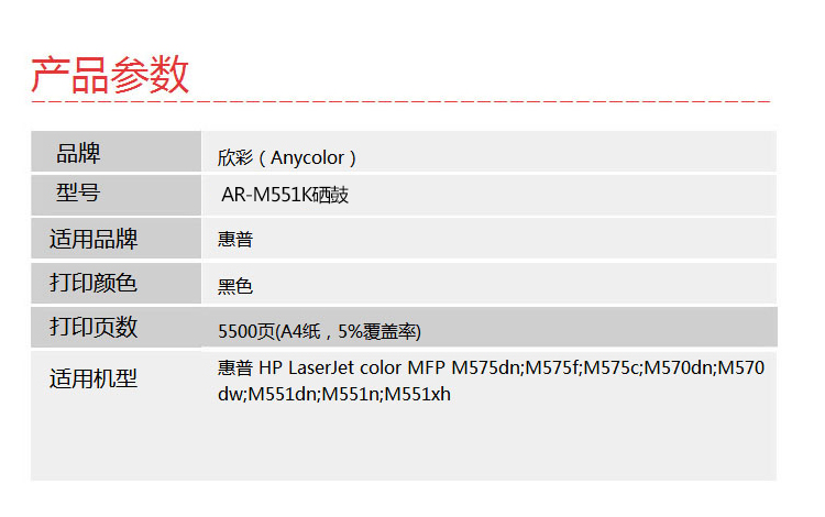 欣彩(Anycolor) AR-M551BK 专业版 5500页 适用惠普M551n 硒鼓 1.00 只/支 (计价单位:支) 黑色