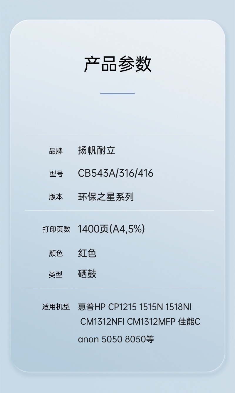 扬帆耐立(YFHC) CB543A/316/416 打印量约1400页 适用惠普1215 1518 硒鼓 1.00 只/支 (计价单位:支) 红色