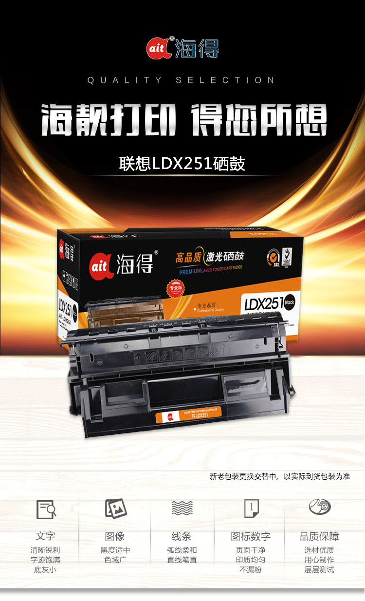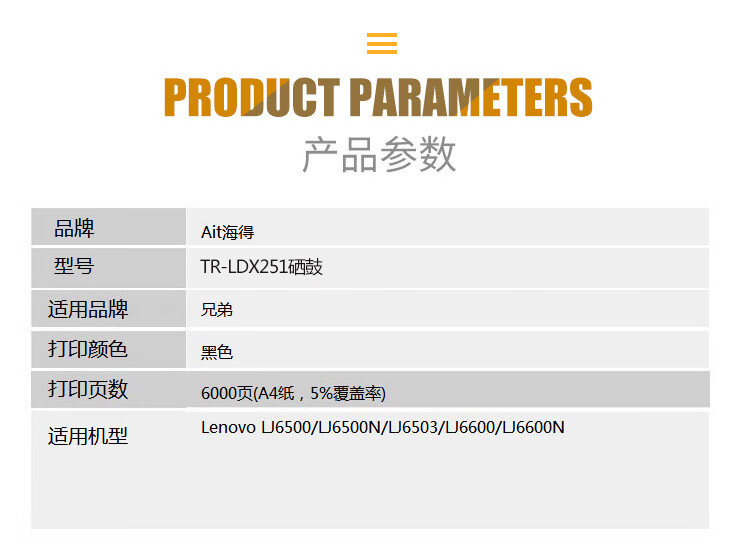 海得(ait) TR-LDX251 专业版 适用机型:联想Lenovo LJ650 LJ6500 LJ6600 LJ6600N 打印量:6000页 硒鼓 1.00 只/支 (计价单位:支) 黑色