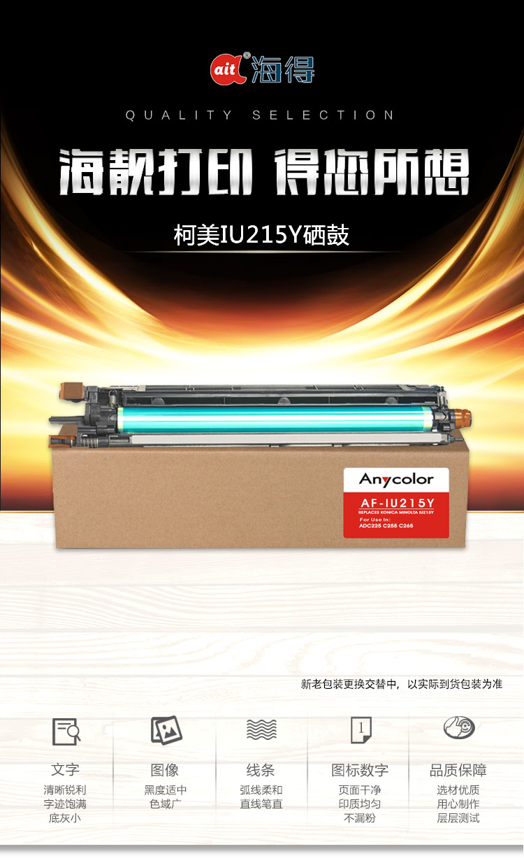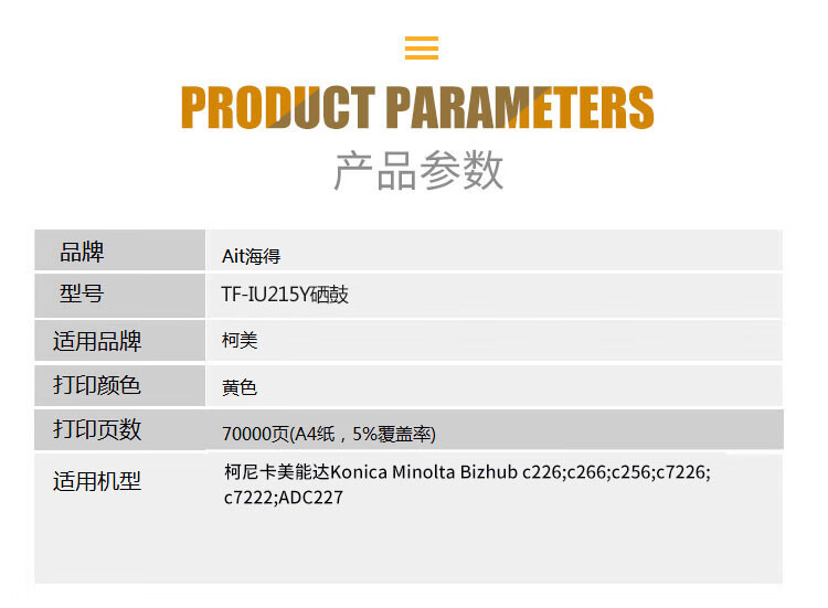 海得(ait) TF-IU215Y 鼓架专业版 适用机型:柯尼卡美能达 C226 266 256 7222 7226 感光鼓 打印量:70000页 硒鼓 1.00 只/支 (计价单位:支) 黄色