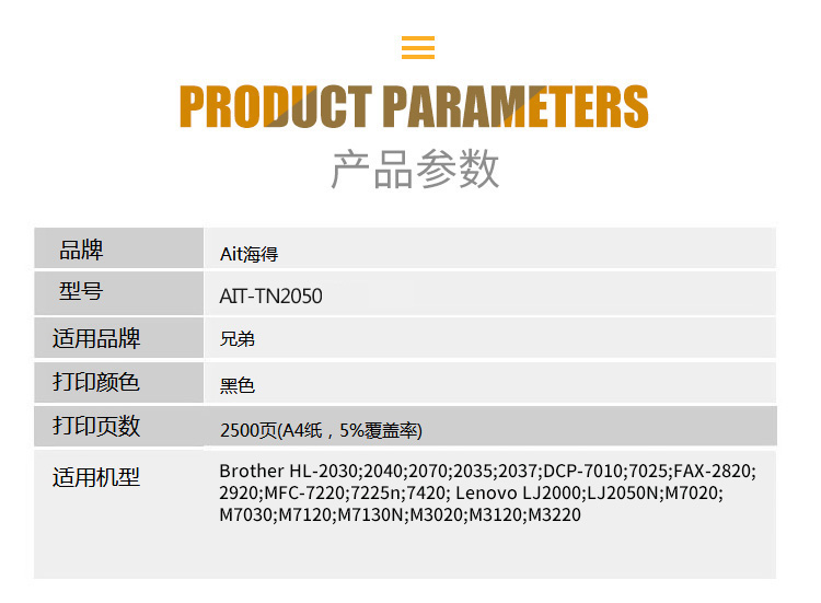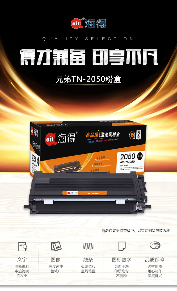 海得(ait) AIT-TN2050 专业版 适用机型:兄弟2030 2040 2070 7010 7420 FAX2820 打印量:2500页 粉盒 1.00 只/支 (计价单位:支) 黑色