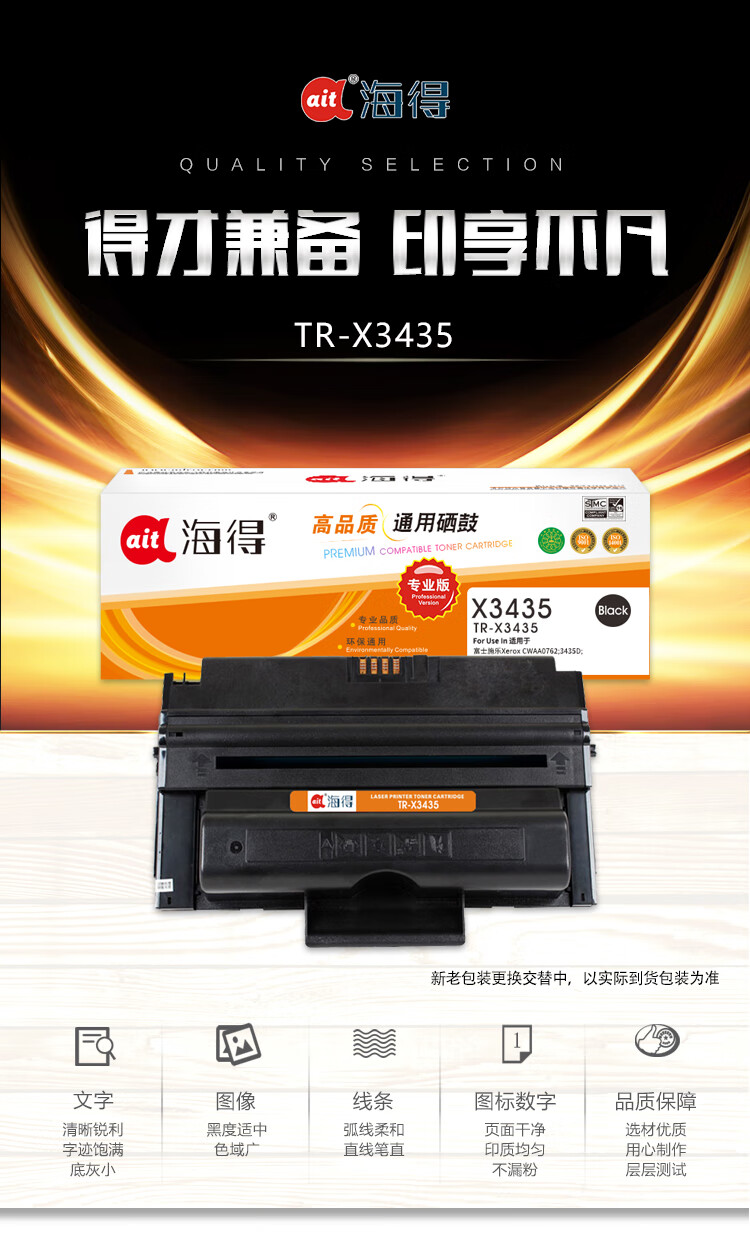 海得(ait) AIT-X3435 专业版 适用机型:施乐3435D 3435DN CWAA0762 CWAA0763 打印量:4000页 硒鼓 1.00 只/支 (计价单位:支) 黑色