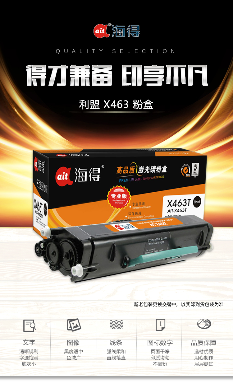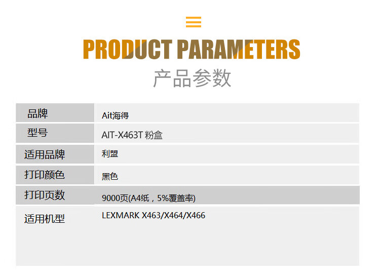 海得(ait) AIT-X463T 专业版 适用机型:利盟X463 X464 X466 X463X21G 打印机 打印量:9000页 粉盒 1.00 只/支 (计价单位:支) 黑色