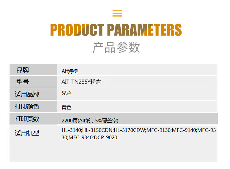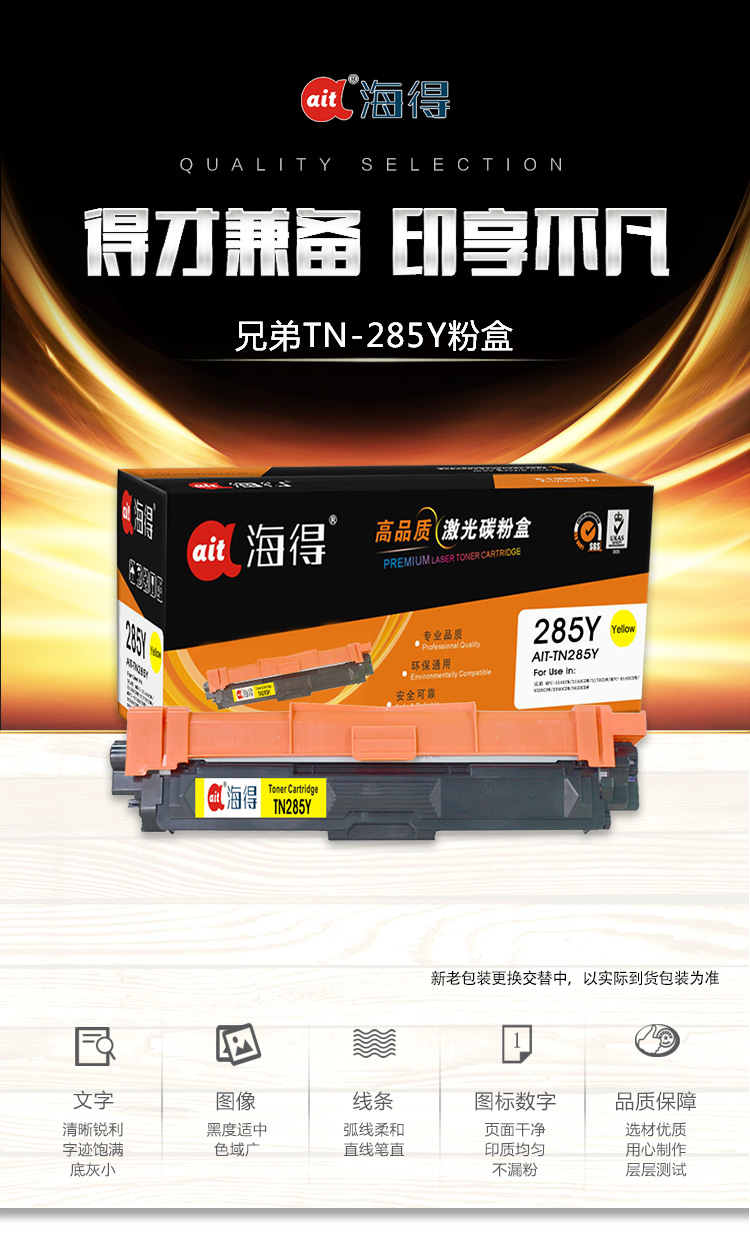 海得(ait) AIT-TN285Y 专业版 适用机型:兄弟3170CDW 3150CDN 9020CDN 打印量:2200页 粉盒 1.00 只/支 (计价单位:支) 黄色