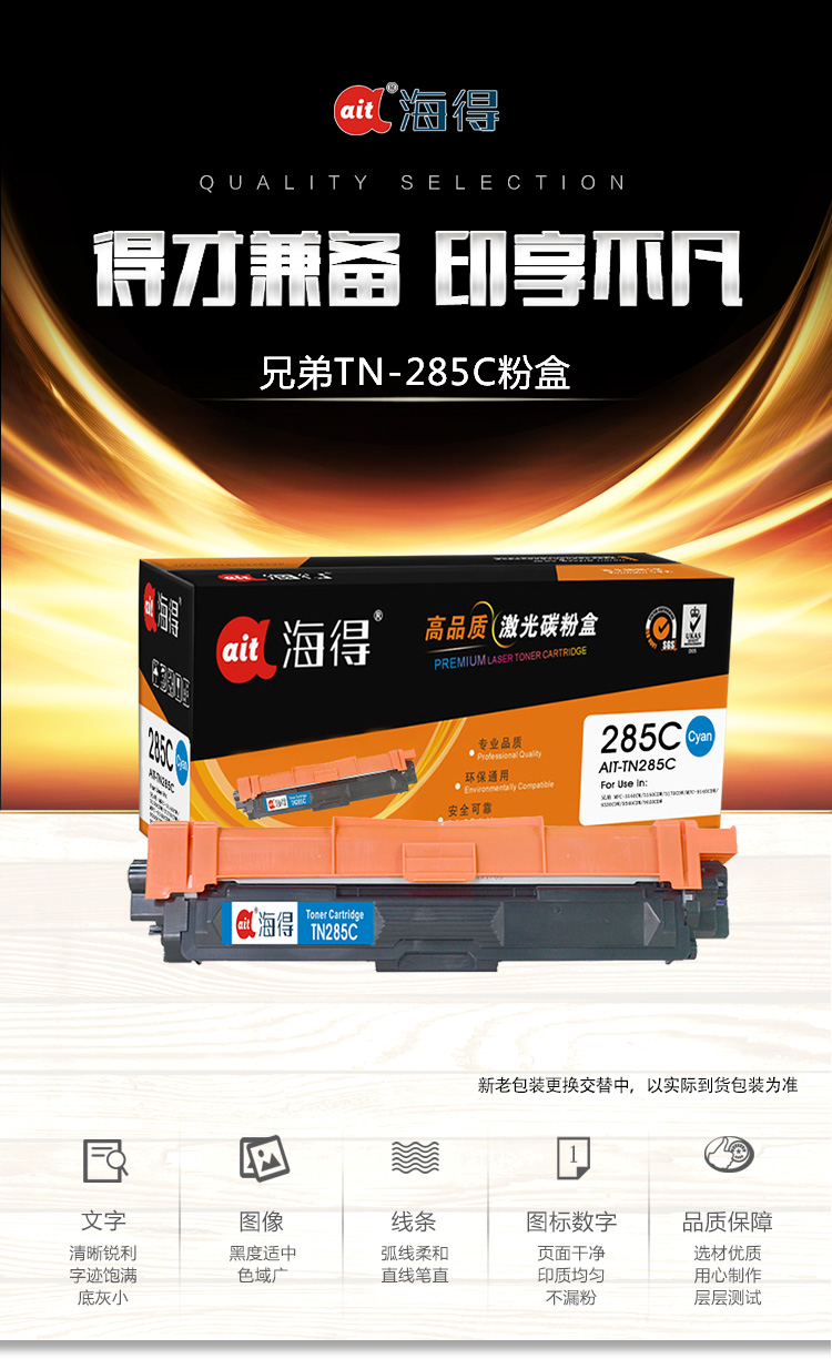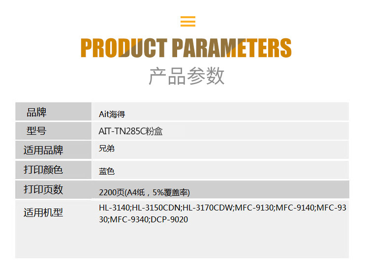 海得(ait) AIT-TN285C 专业版 适用机型:兄弟3170CDW 3150CDN 9020CDN 打印量:2200页 粉盒 1.00 只/支 (计价单位:支) 蓝色