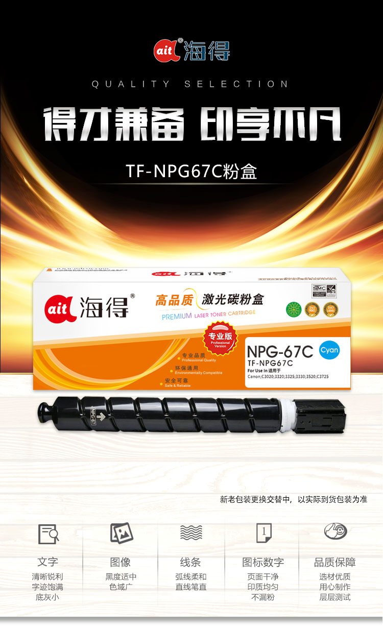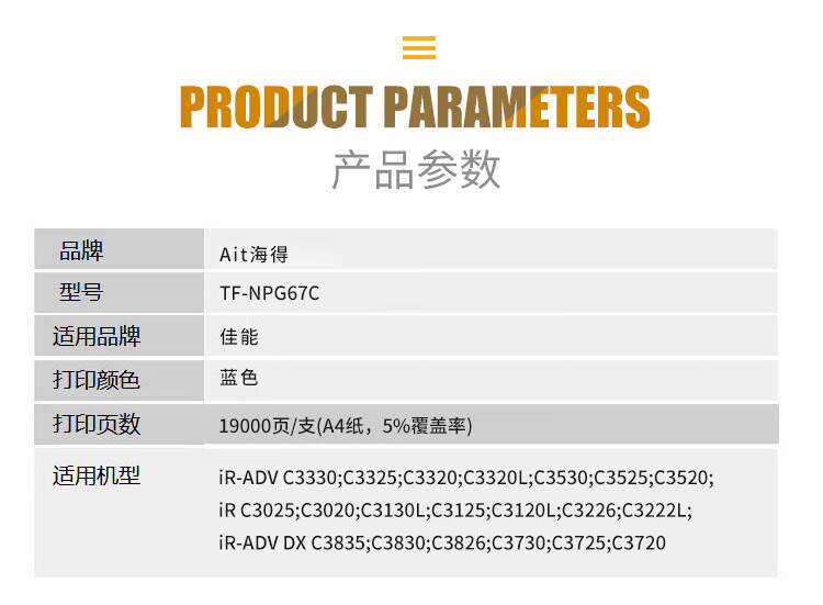 海得(ait) TF-NPG67C 专业版 大容量 适用机型:佳能C3020 3320 3325 3330 3520 复印机 打印量:19000页 粉盒 1.00 只/支 (计价单位:支) 蓝色