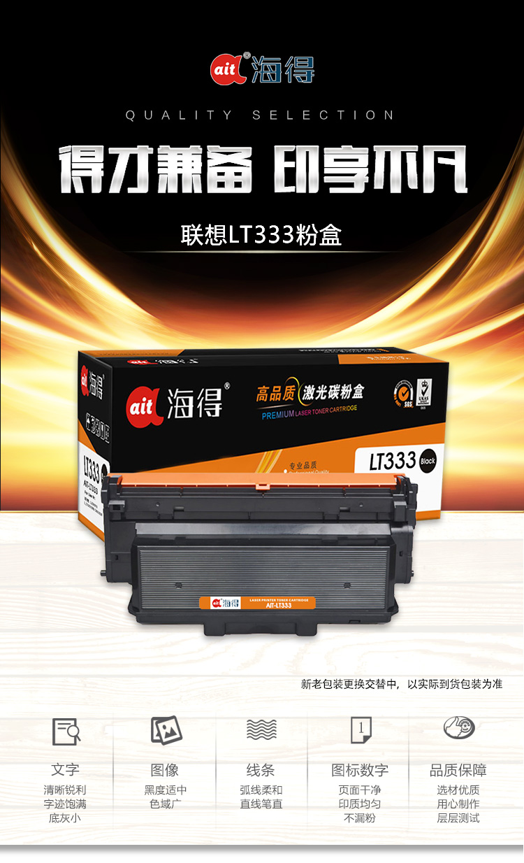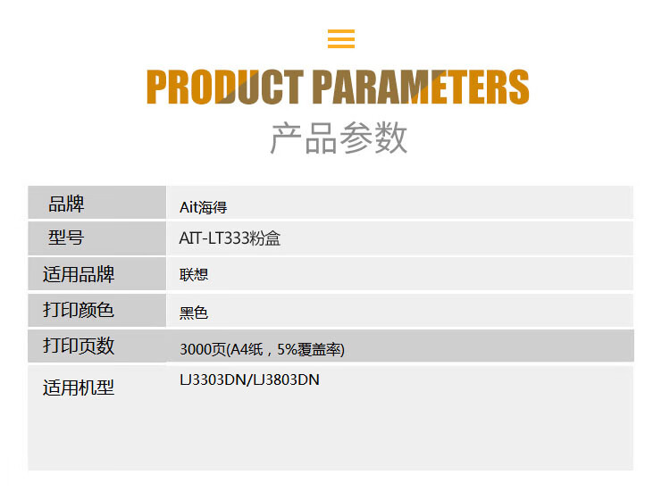 海得(ait) AIT-LT333 专业版 适用机型:联想LENOVO LJ3303DN LJ3803DN 打印量:3000页 粉盒 1.00 只/盒 (计价单位:盒) 黑色