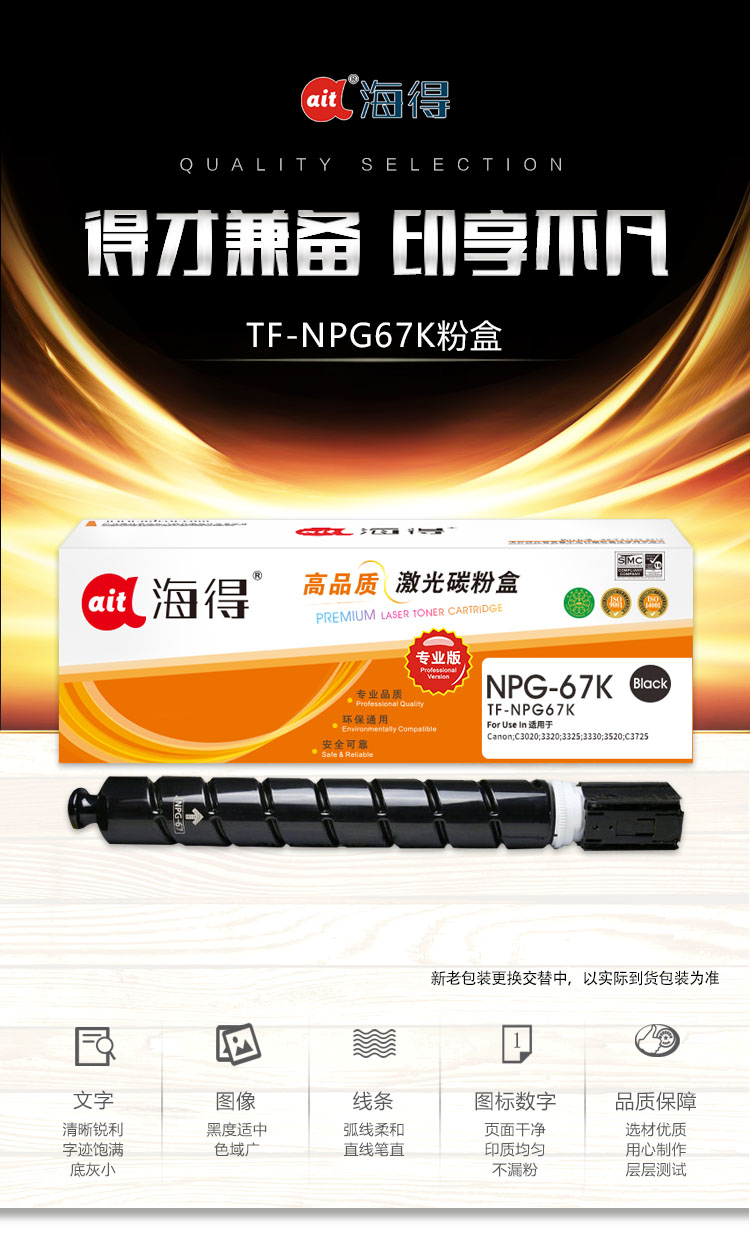 海得(ait) TF-NPG67K 专业版 大容量 适用机型:佳能C3020 3320 3325 3330 3520 打印量:36000页 粉盒 1.00 只/支 (计价单位:支) 黑色