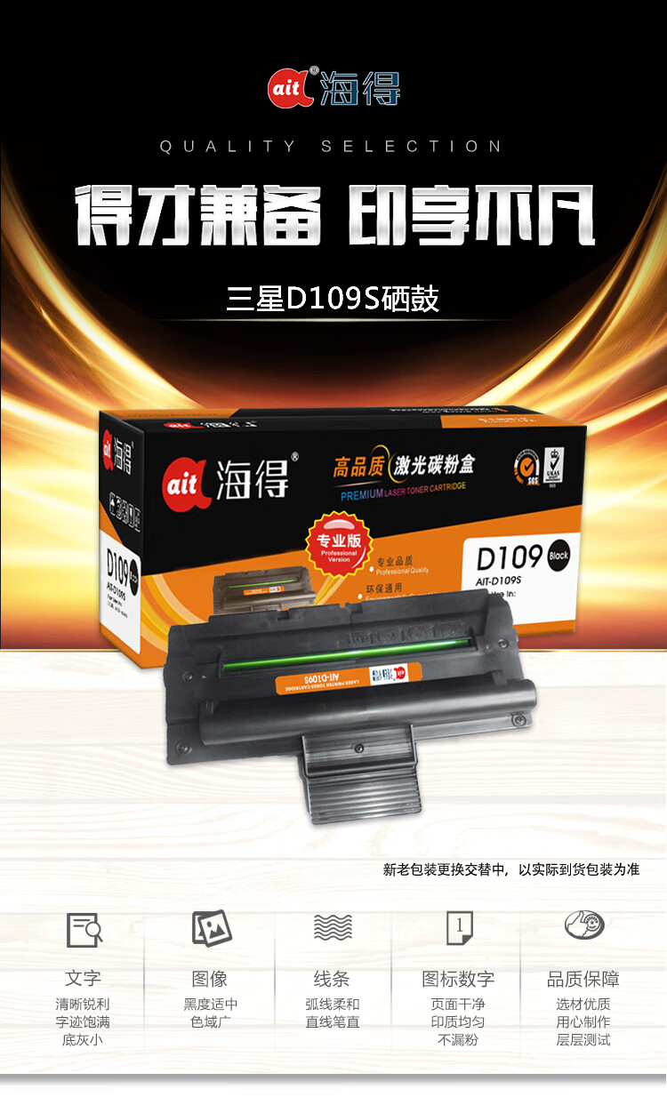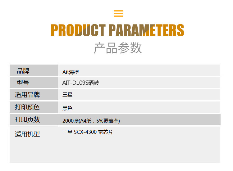 海得(ait) AIT-D109S 专业版带芯片 适用机型:三星 MLT-D109S SCX-4300 打印量:2000页 硒鼓 1.00 只/盒 (计价单位:盒) 黑色