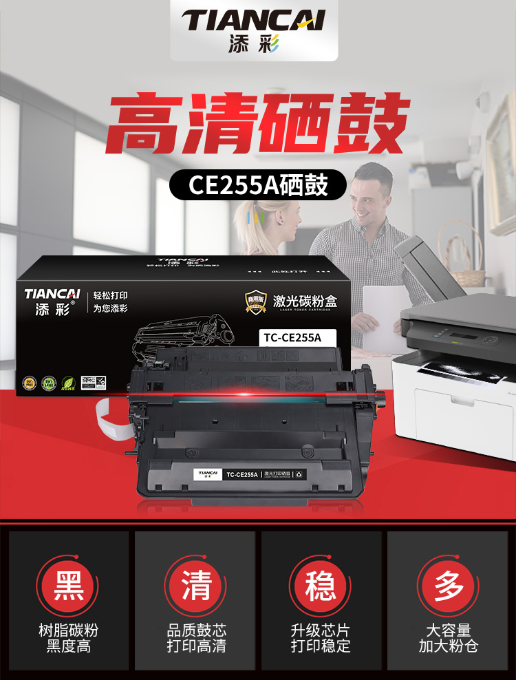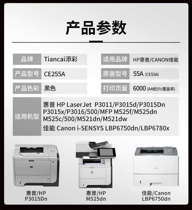 添彩 TC-CE255A 商用版 适用于HP P3011/P3015/P3016 佳能 LBP6750dn/LBP6780x 打印量6000页 硒鼓 1.00 只/个 (计价单位:个) 黑色 黑色