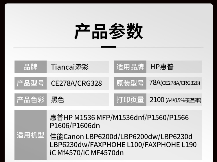 添彩 TC-CE278A 商用版 适用于M1536/P1560/P1566 硒鼓 (个) 黑色 黑色