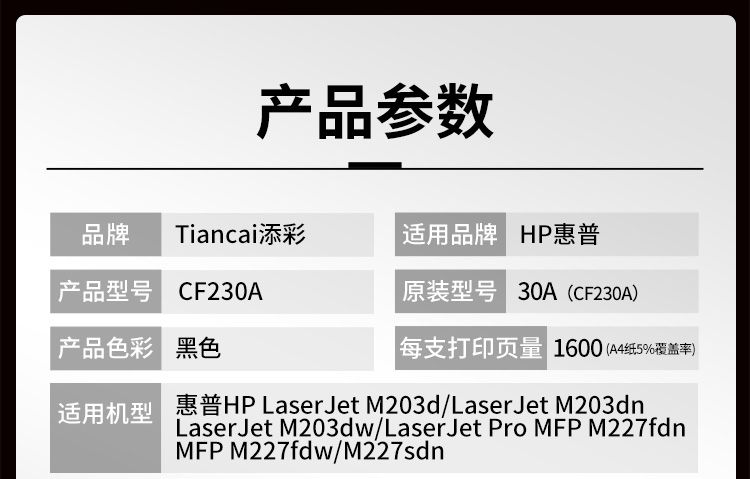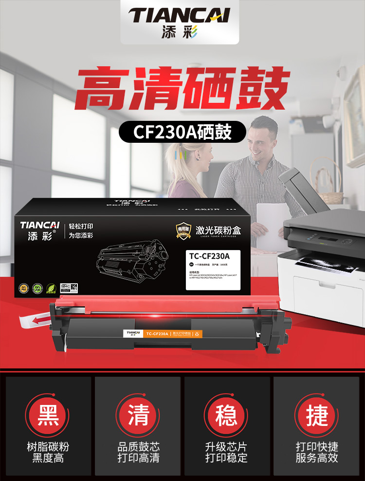 添彩 TC-CF230A 商用版 适用于HP LaserJet M203d/M203dn/M203dw 打印量1600页 粉盒 1.00 只/个 (计价单位:个) 黑色 黑色