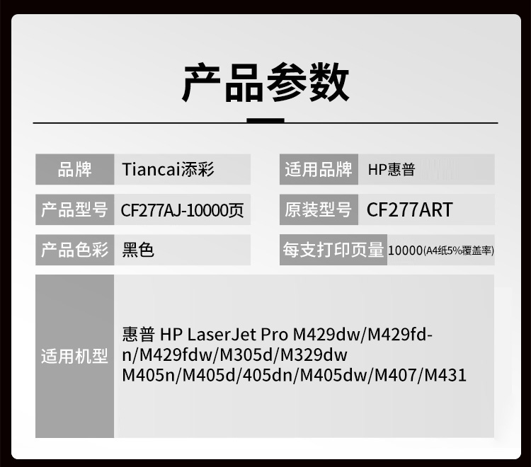 添彩TC-CF277AJ (适用HPM429dw/M429fdn/M429fdw 带芯片商用版硒鼓只 黑色-10000页