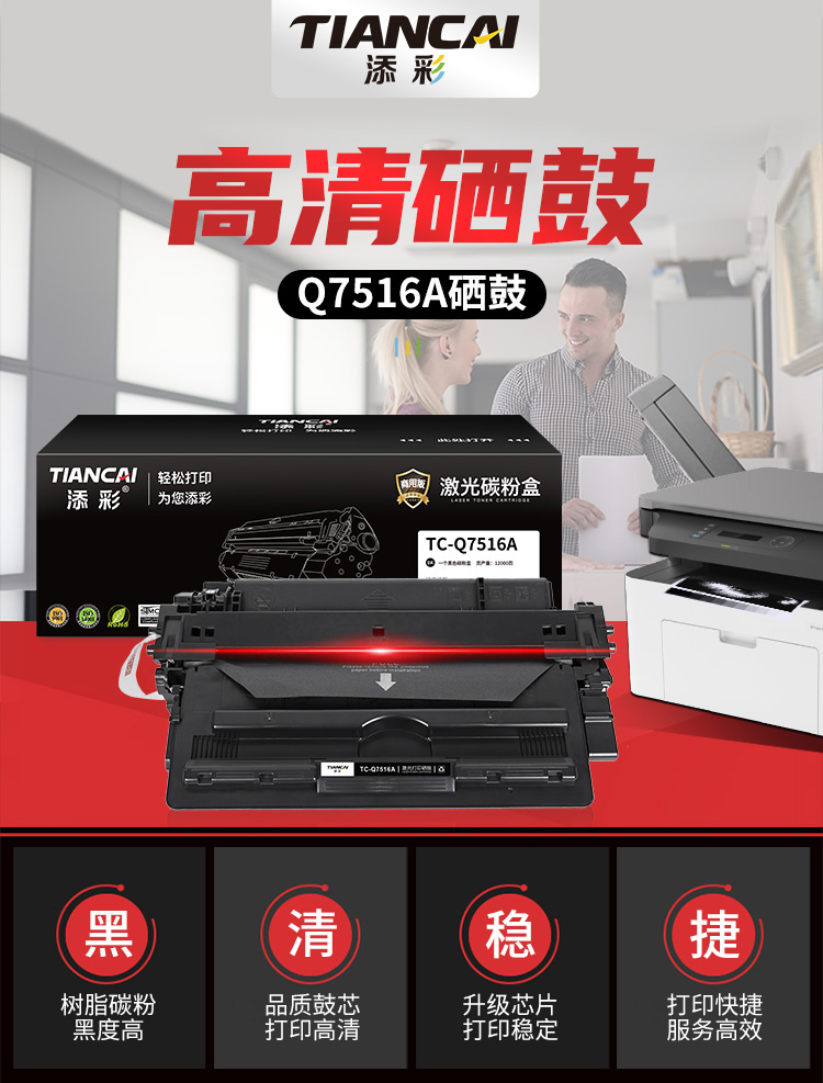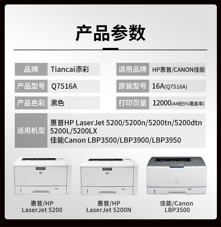 添彩 TC-Q7516A 商用版 适用于HP LaserJet 5200 佳能 LBP3500 3900 3950 打印量12000页 硒鼓 1.00 只/个 (计价单位:个) 黑色 黑色