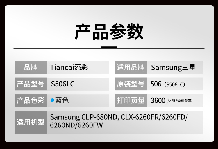 添彩 TC-S506LC 3500页(适用于Samsung CLP-680ND, CLX-6260FR/6260FD/6260ND/) 商用装激光碳粉盒 (计价单位:只) 青色 青色