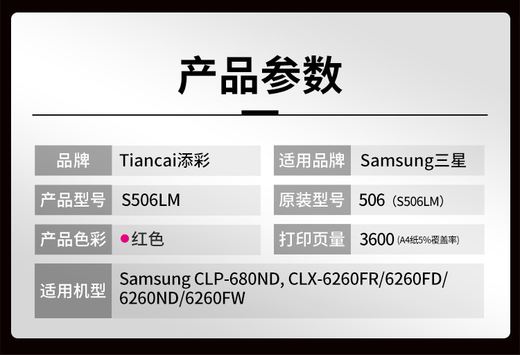 添彩 TC-S506LM 3500页(适用于Samsung CLP-680ND, CLX-6260FR/6260FD/6260ND/) 商用装激光碳粉盒 (计价单位:只) 洋红色 洋红色