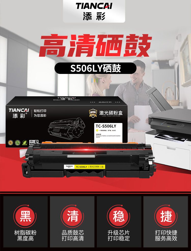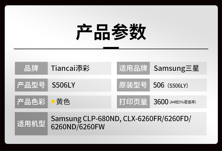 添彩 TC-S506LY 3500页(适用于Samsung CLP-680ND, CLX-6260FR/6260FD/6260ND/) 商用装激光碳粉盒 (计价单位:只) 黄色 黄色