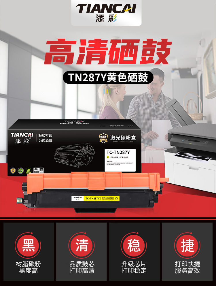 添彩TC-TN287Y商用版 适用于Brother HL-3160CDW HL-3190CDW粉盒个 黄色- 打印量2300页