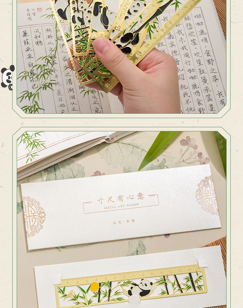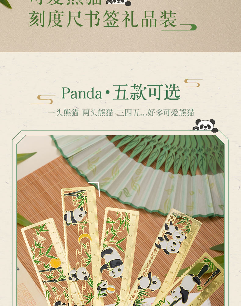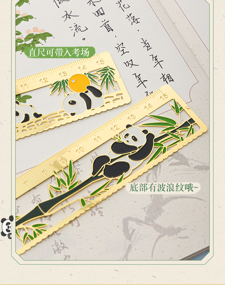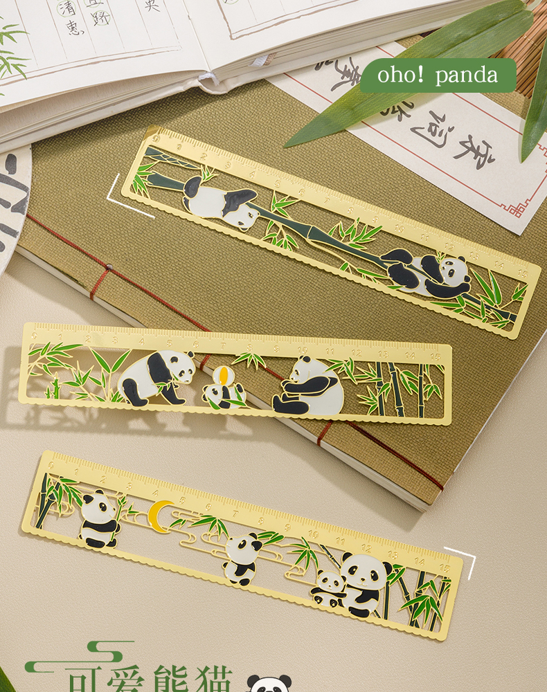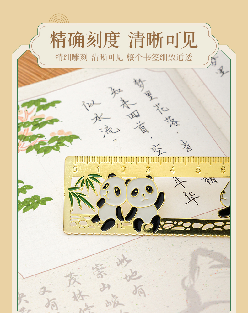 三年二班熊猫金属书签尺子二合一中国风小学生镂空多功能双面刻度直尺手账工具奖品小礼物/个 四头熊猫款式