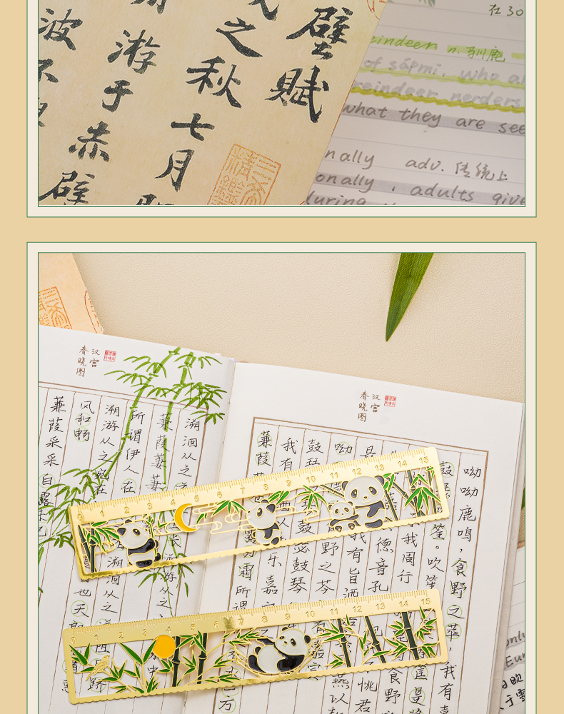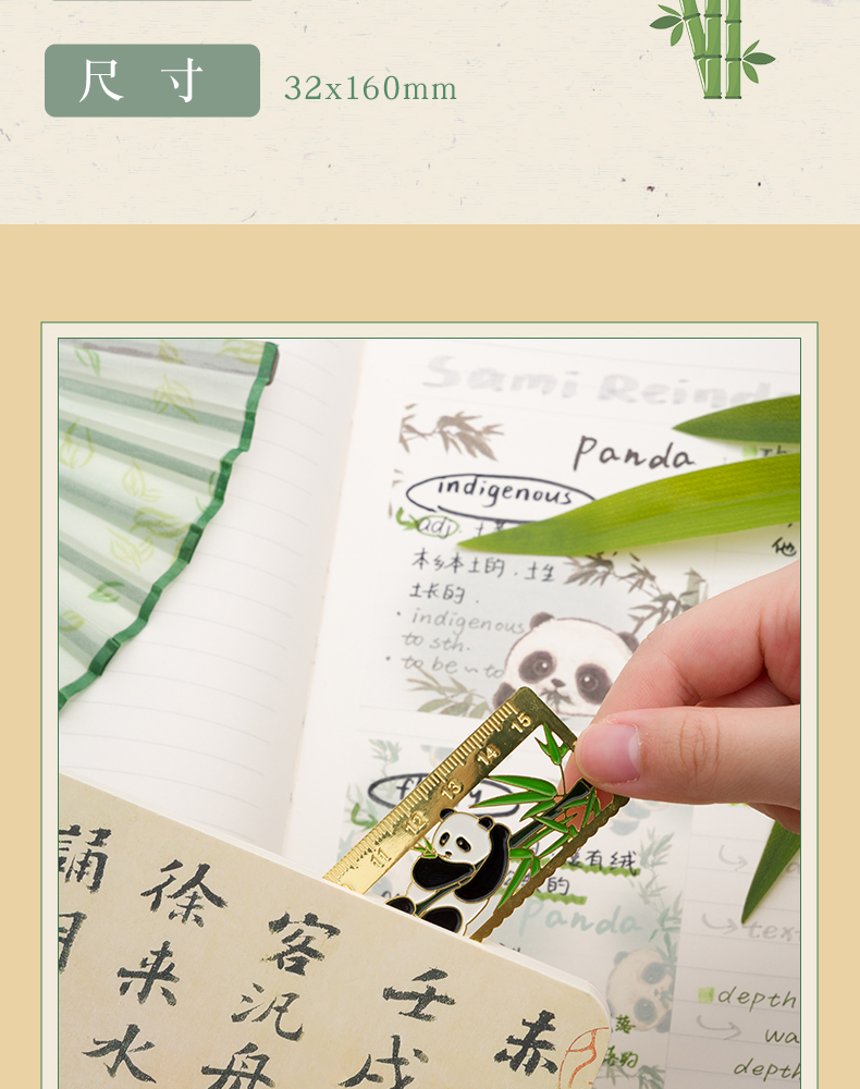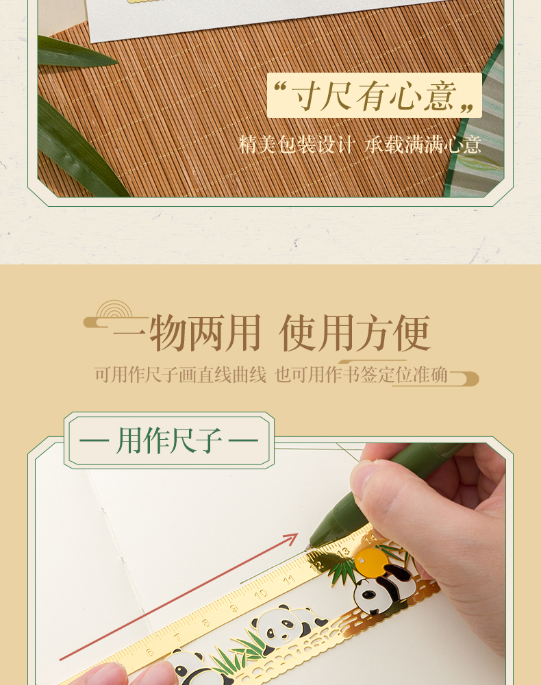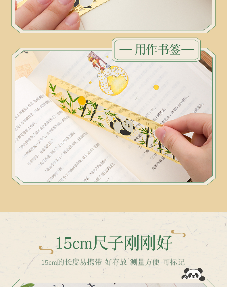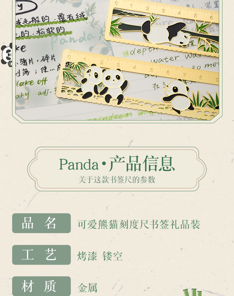 三年二班熊猫金属书签尺子二合一中国风小学生镂空多功能双面刻度直尺手账工具奖品小礼物/个 四头熊猫款式