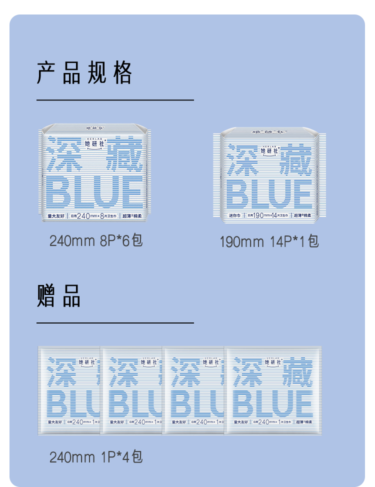她研社深藏BLUE日用组合卫生巾7包共62片+4片同款日用便携装