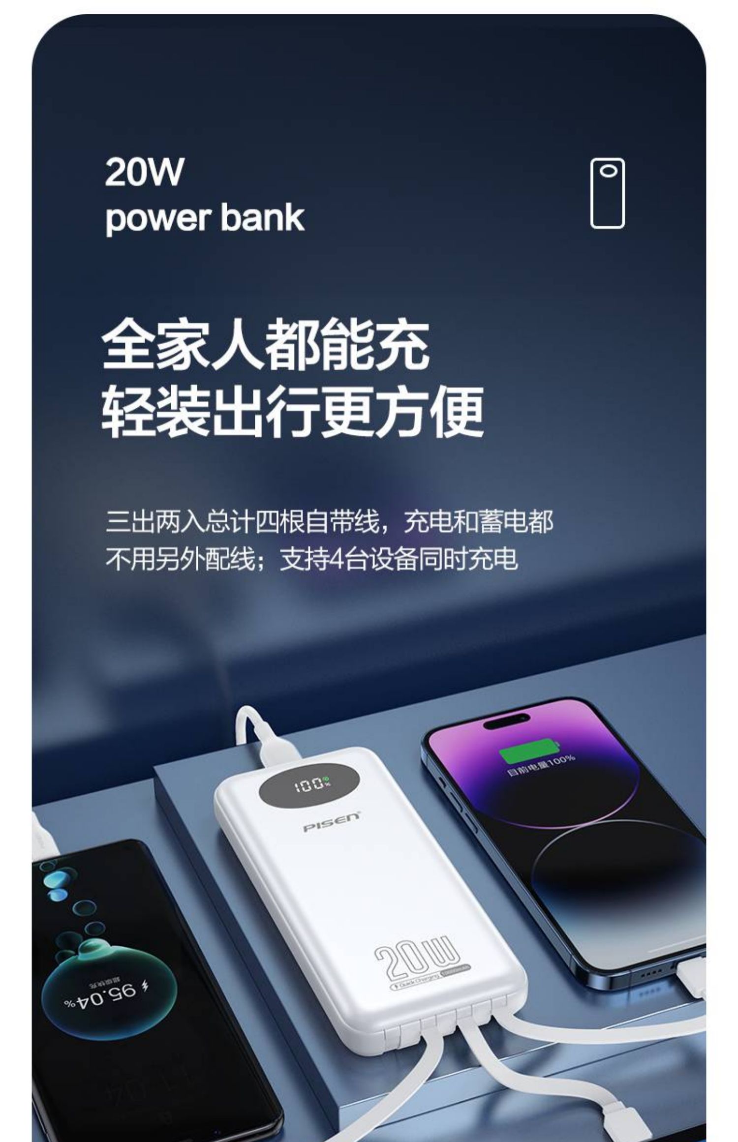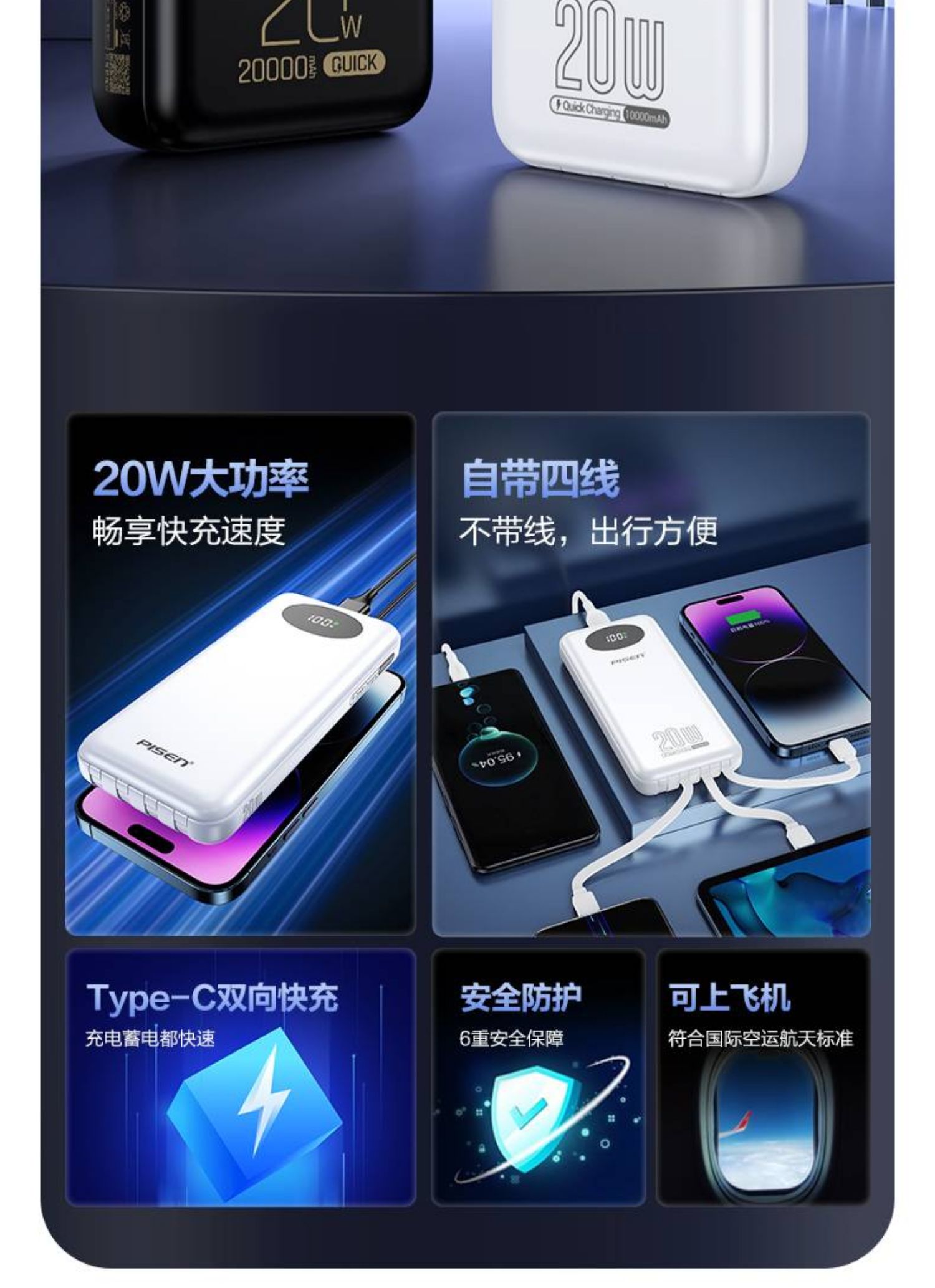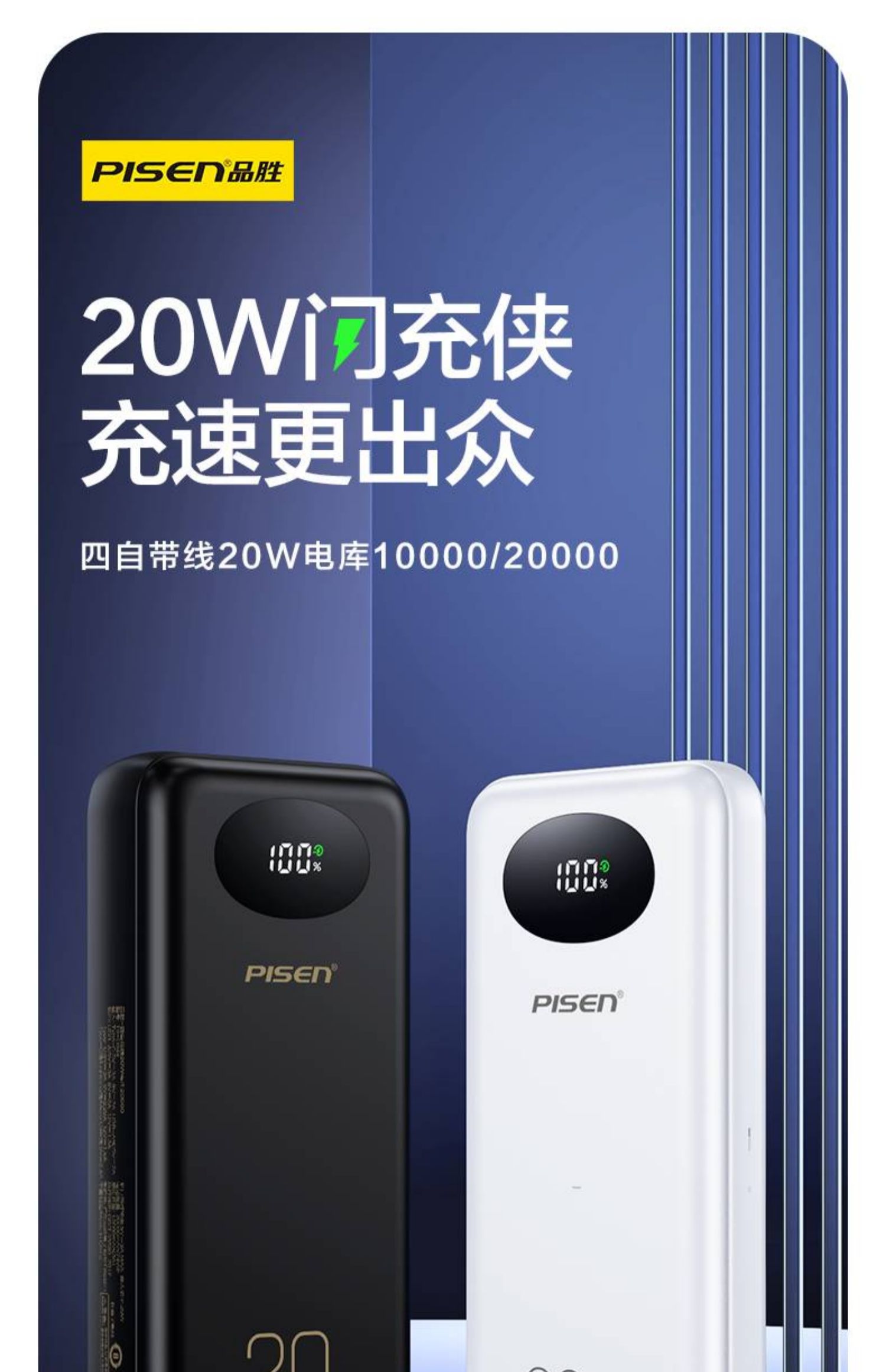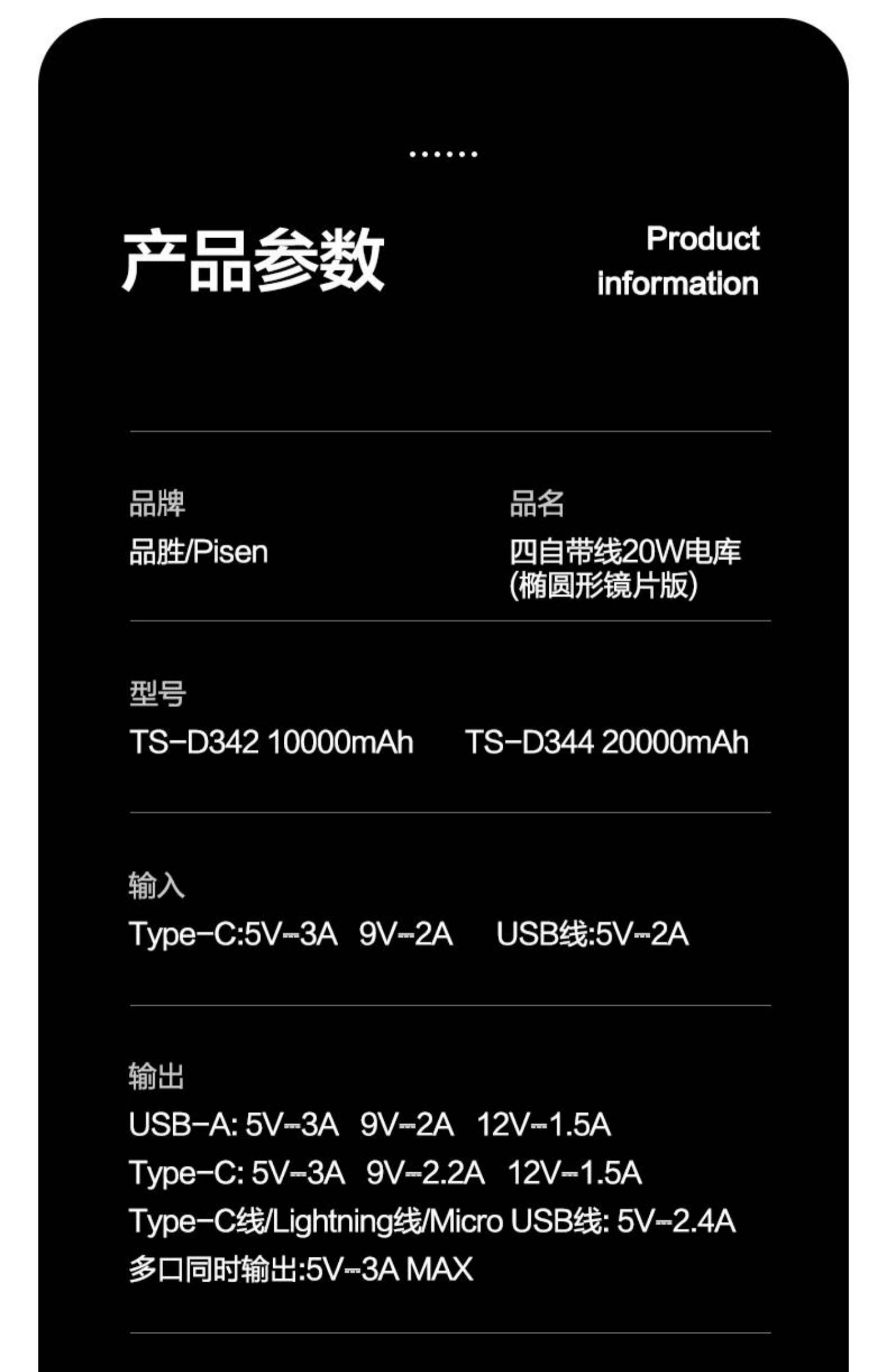 品胜充电宝10000毫安PD20W快充自带四线移动电源适用苹果安卓通用 白色
