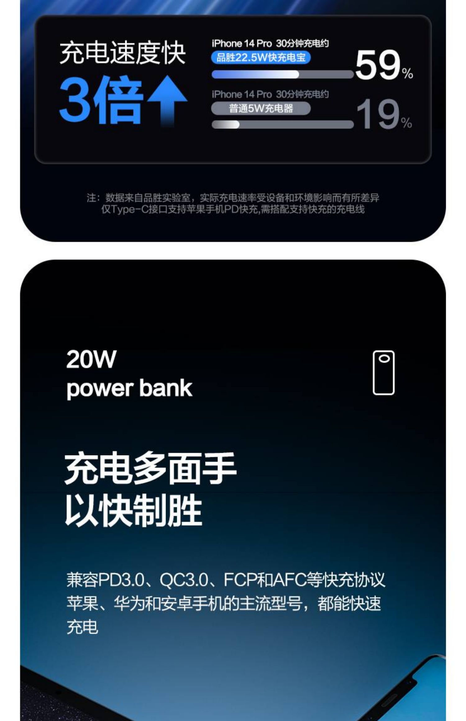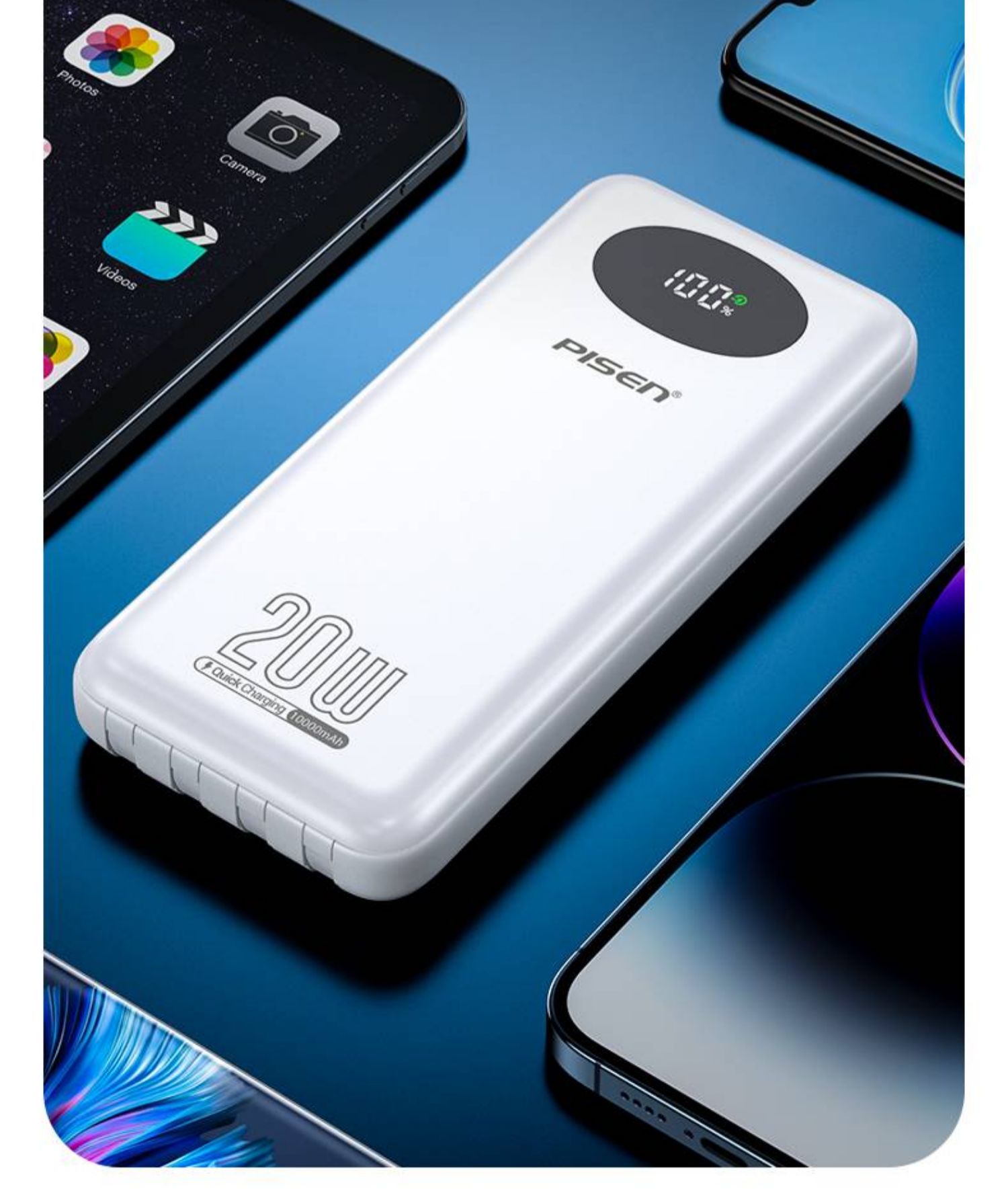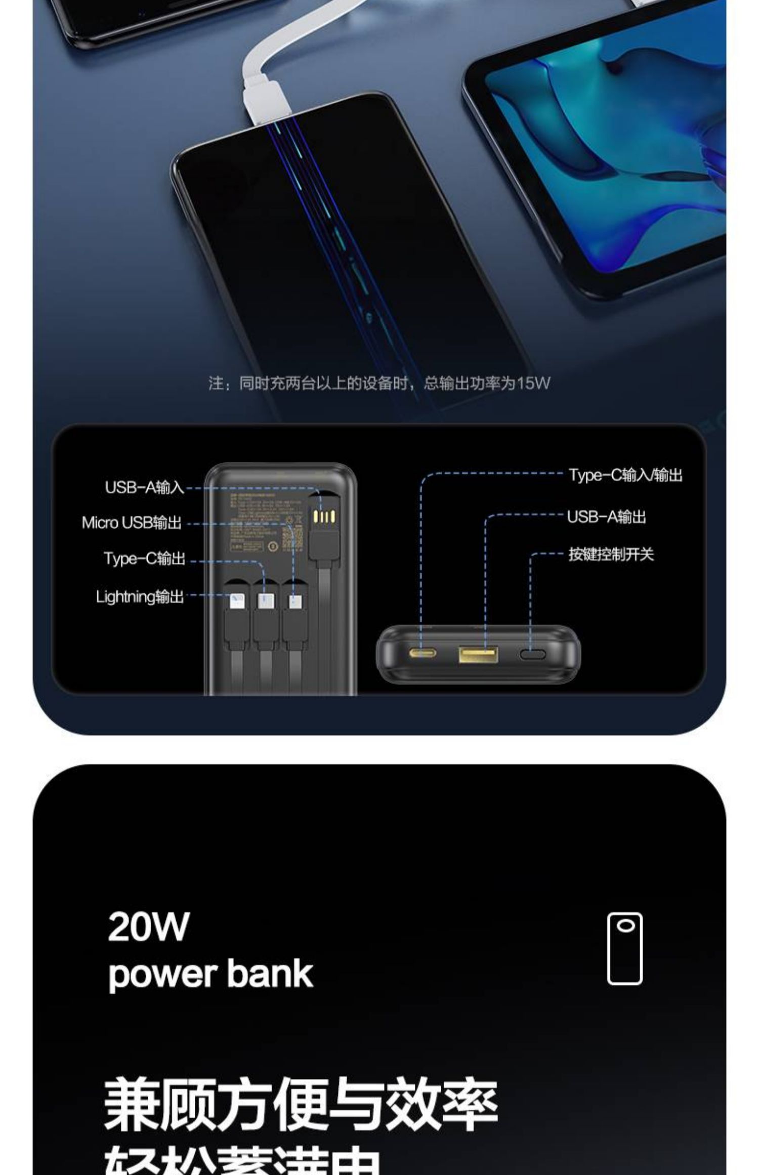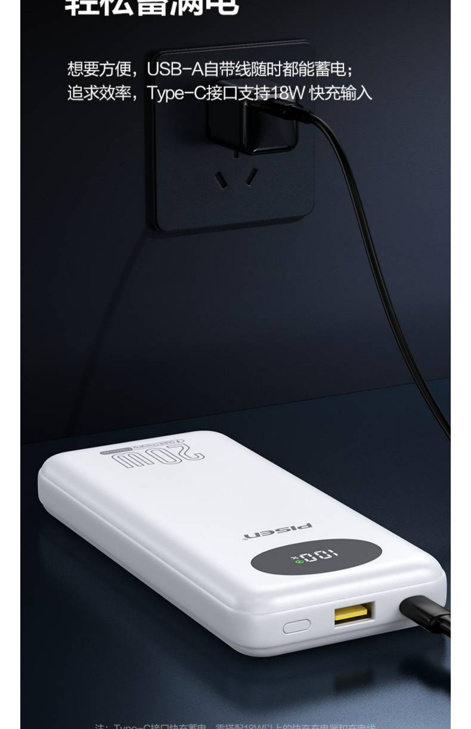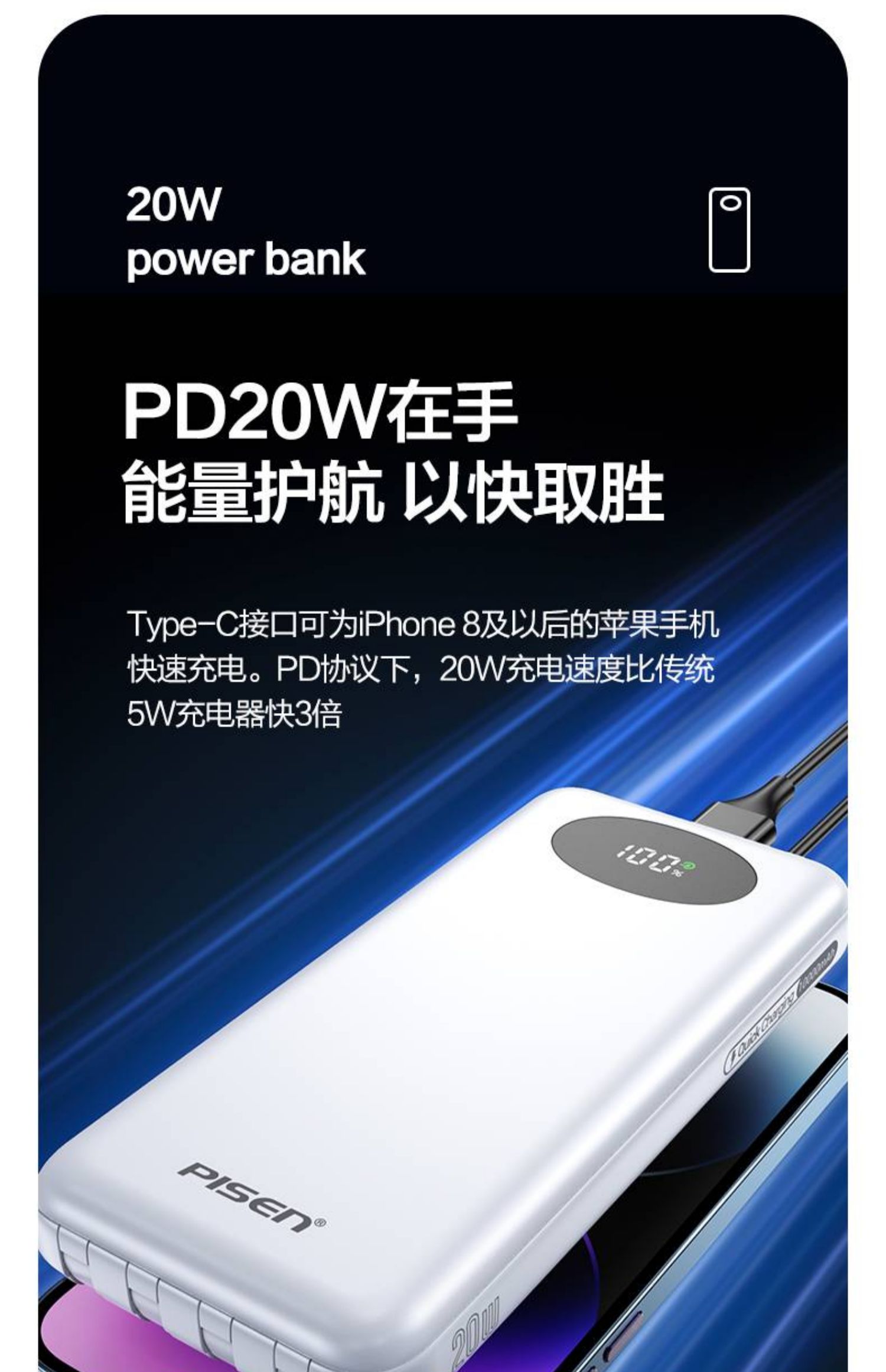 品胜充电宝10000毫安PD20W快充自带四线移动电源适用苹果安卓通用 白色