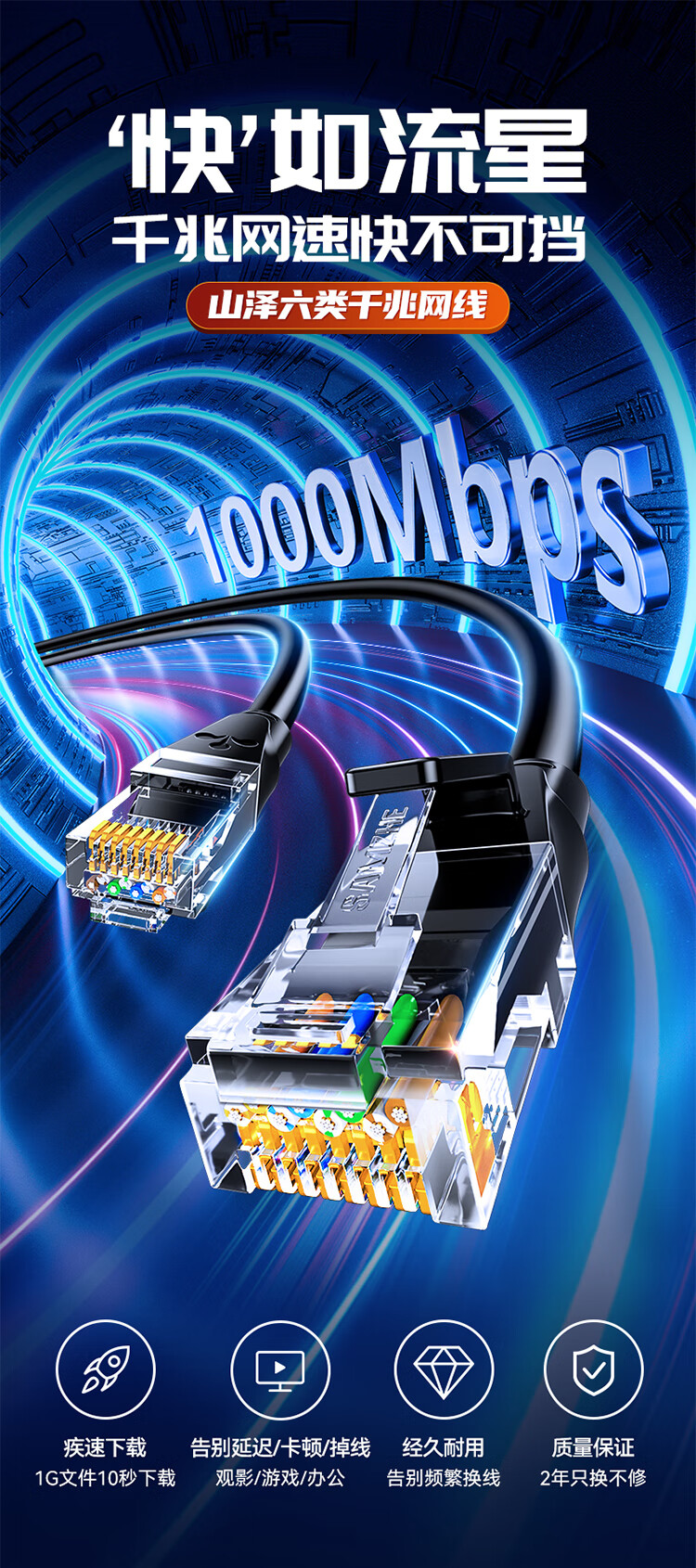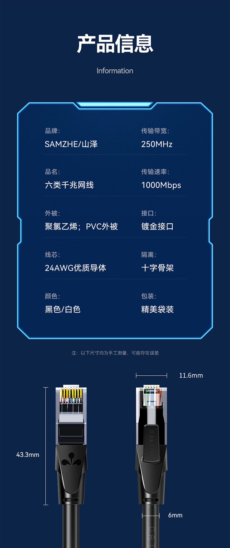 山泽(SAMZHE)六类网线 CAT6类千兆极速8芯双绞黑色3米 WD6030(单位:个) 黑色