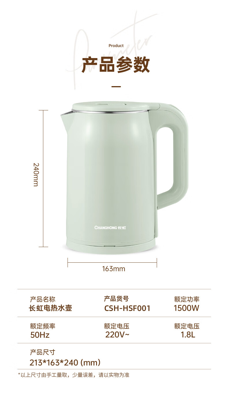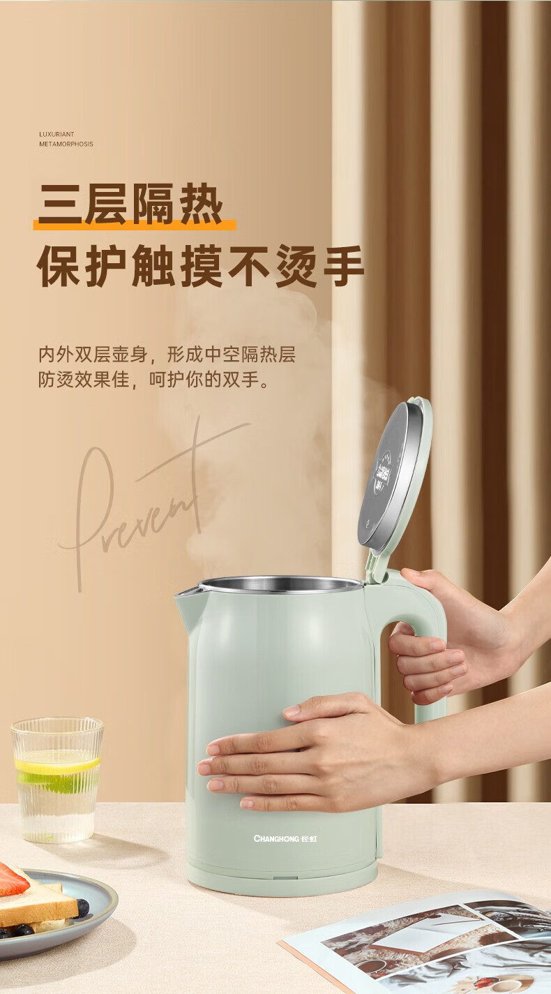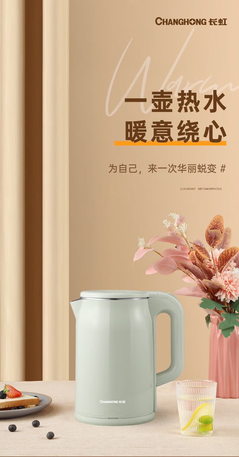 长虹电热水壶 304不锈钢双层防烫 1.8L大容量CSH-HSF001单位:个 薄荷绿