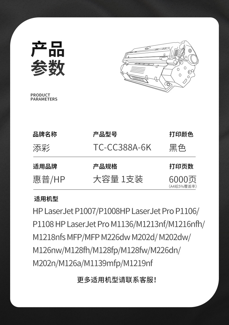 添彩TC-CC388A-6K商用装适用HP P1007/1008/1106打印6000页激光碳粉盒支 黑色