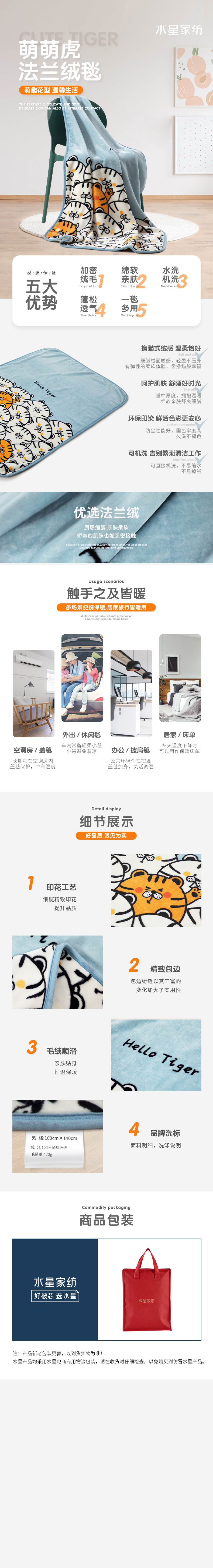 水星家纺 萌萌虎法兰绒毯 122982 深蓝色