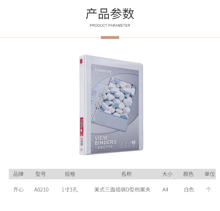 齐心(COMIX) 1寸3孔美式三面插袋D型档案夹 A0210 A4 白色(单位:个)