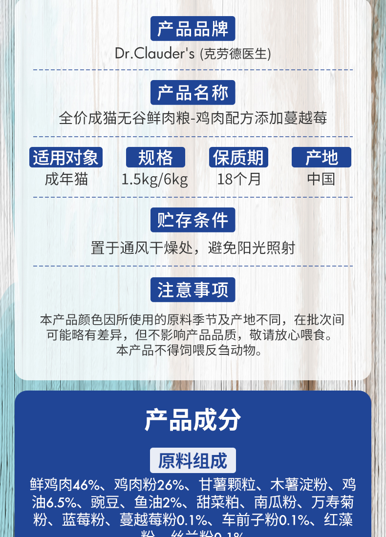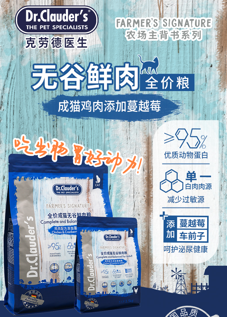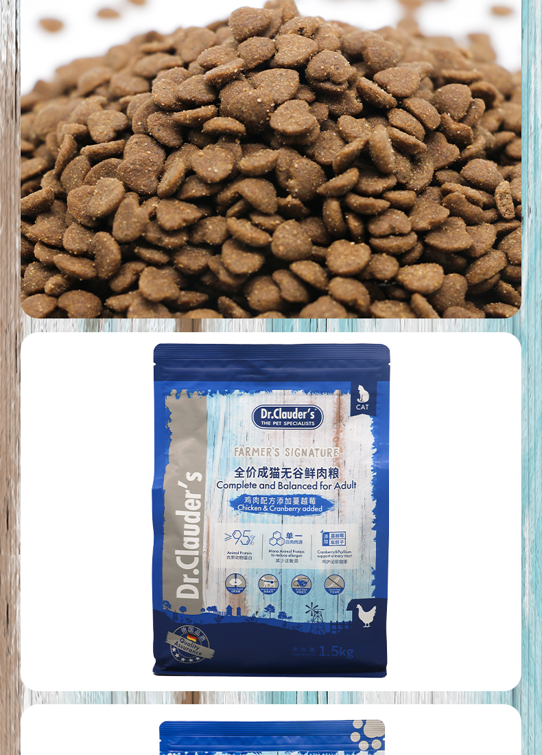 克劳德医生 成猫粮 成猫用无谷鲜肉粮鸡肉配方添加蔓越莓 1.5kg 蓝色(单位:袋)