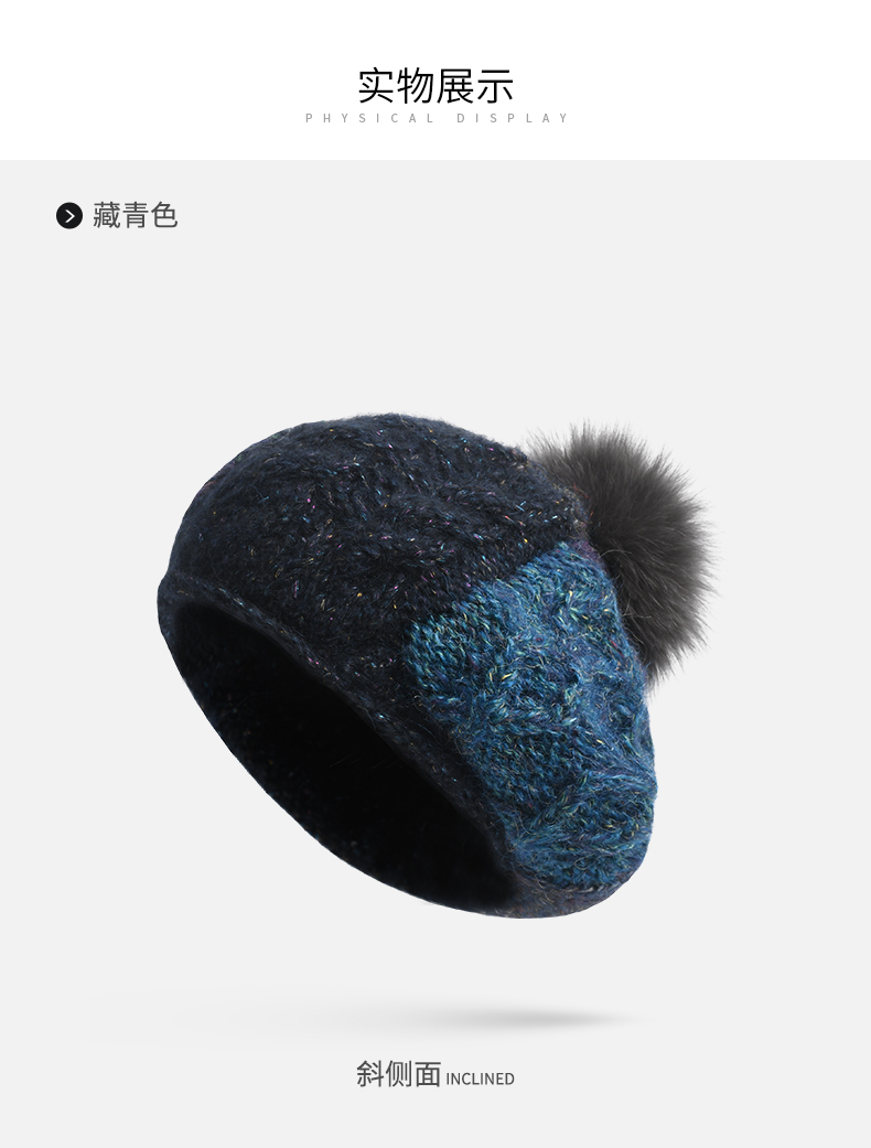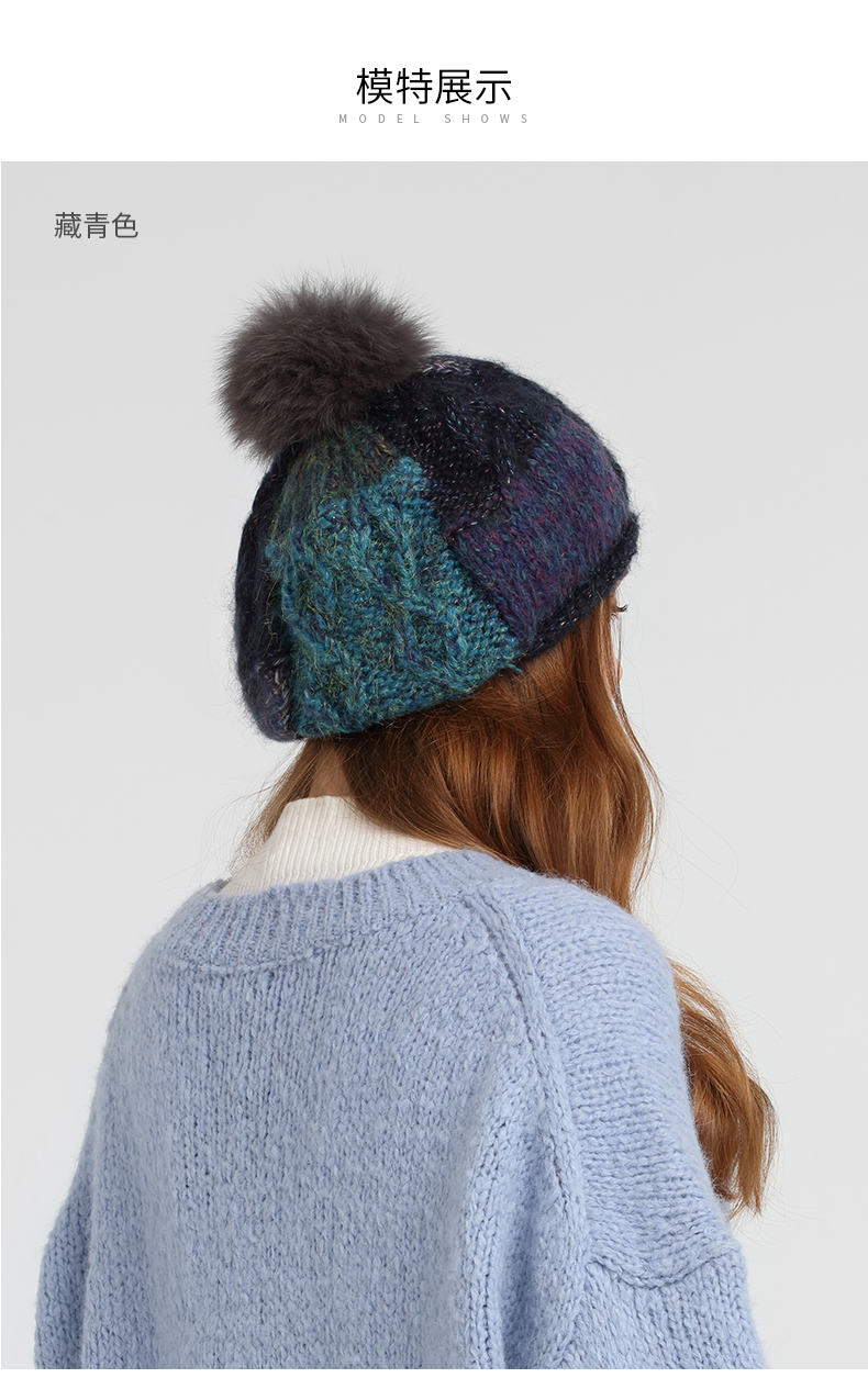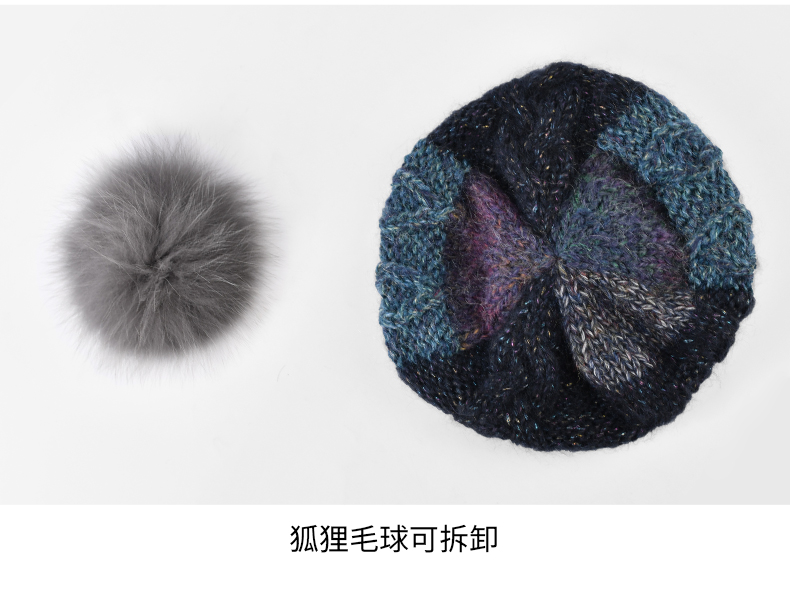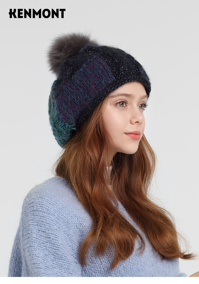 卡蒙(Kenmont) 狐狸毛球拼色卷边贝雷帽 KM-9233-13 帽围58cm(弹性佳) 藏青色(单位:顶)