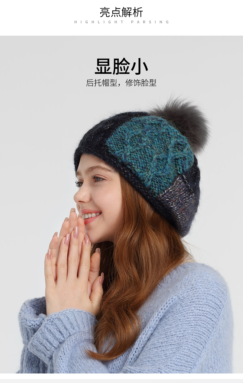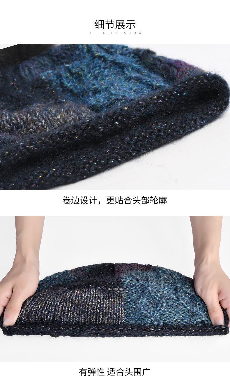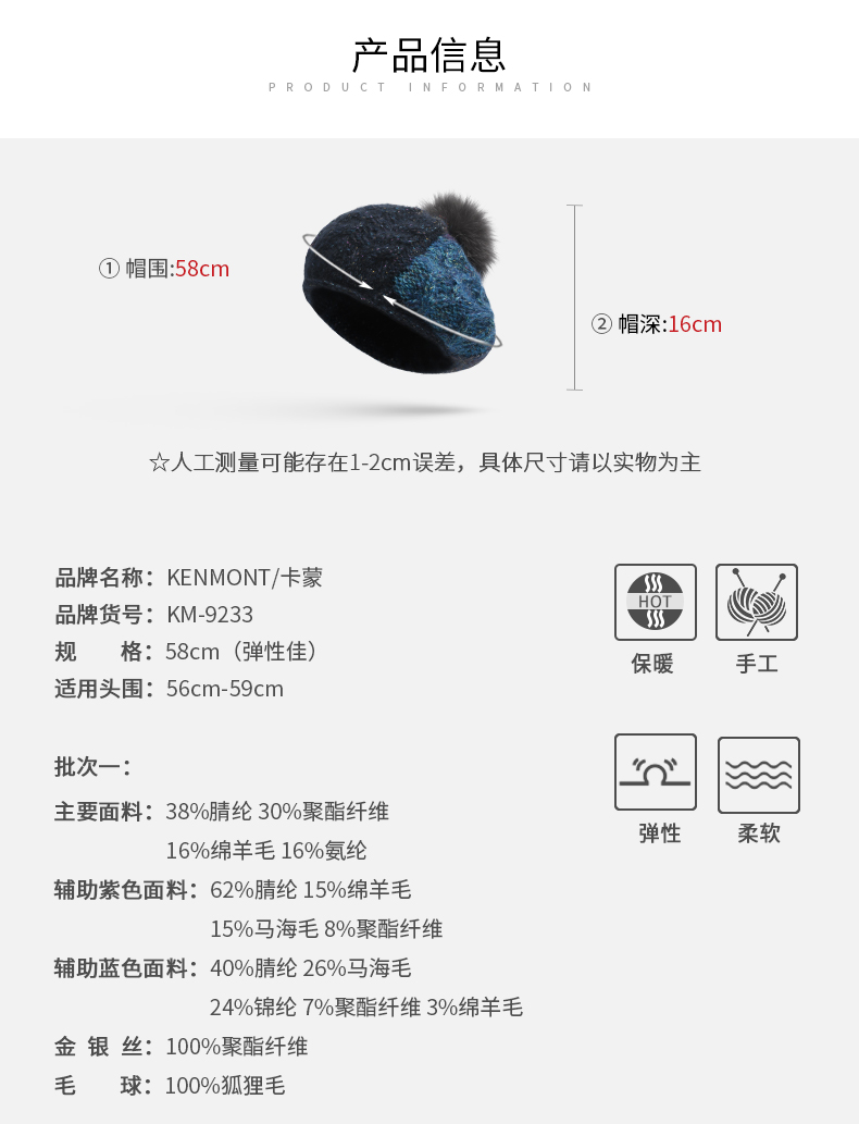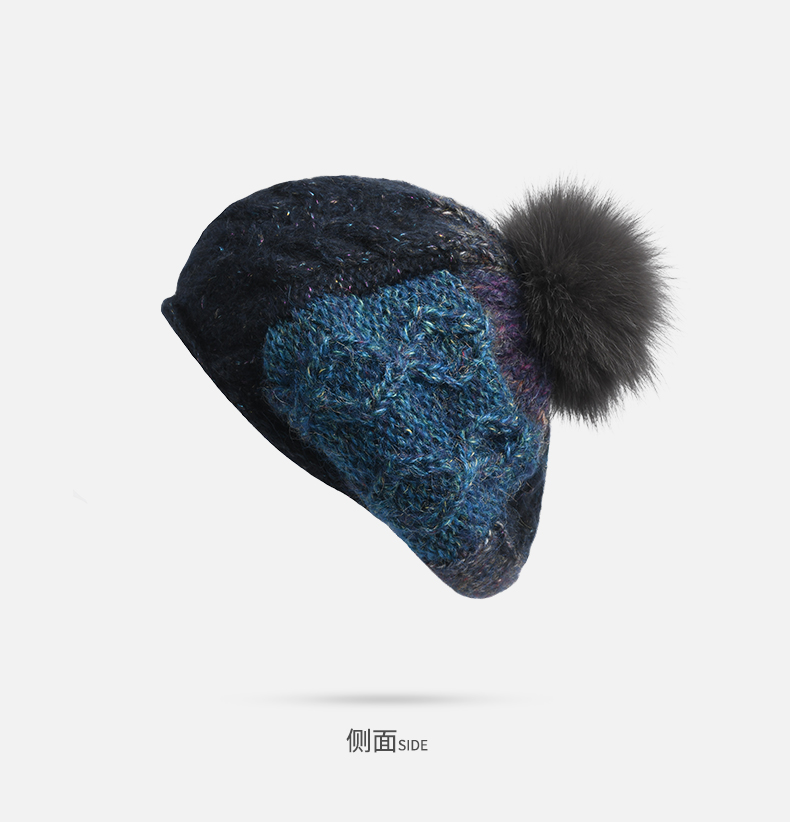 卡蒙(Kenmont) 狐狸毛球拼色卷边贝雷帽 KM-9233-13 帽围58cm(弹性佳) 藏青色(单位:顶)