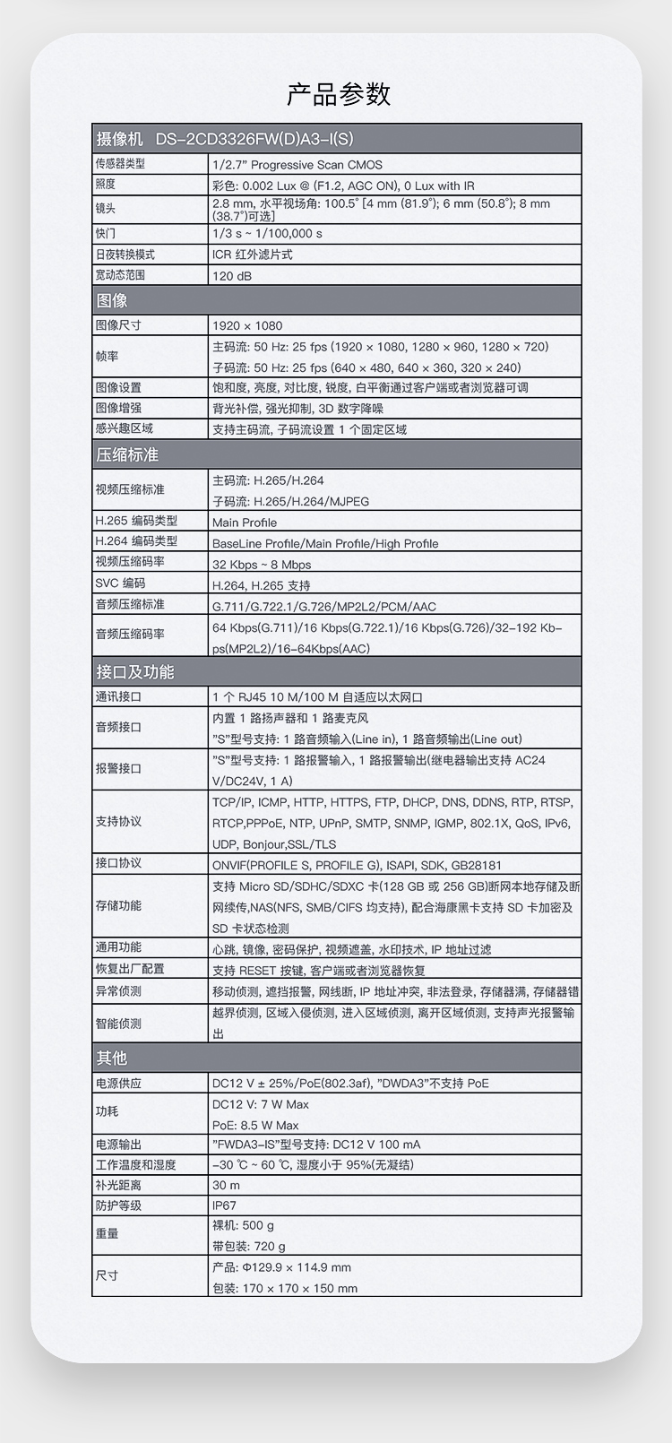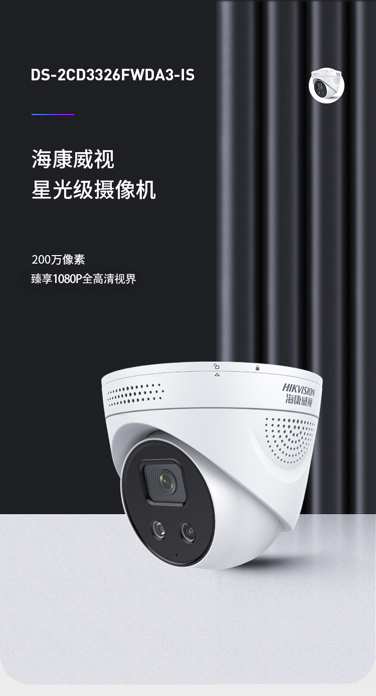 海康威视HIKVISION监控摄像头200万星光级摄像机室外室内智能警戒网线供电音频报警半球3326FWDA3-IS 4mm 灰色