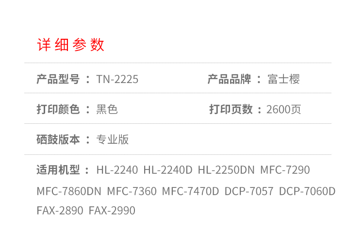 富士樱TN-2225墨粉盒 专业版 黑色单支装 适用于兄弟HL2240D MFC7360 7470D 黑色