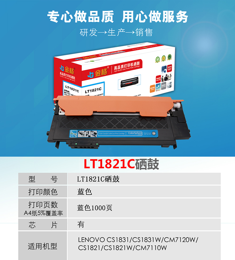 金格LT1821C粉盒1支打印量1000页适用联想CS1831 1831W/CM7120W/1821 蓝色