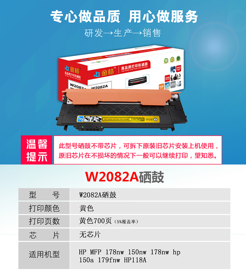 金格W2082A硒鼓1支打印量700页适用惠普HP MFP 178nw 150nw 178nw 黄色