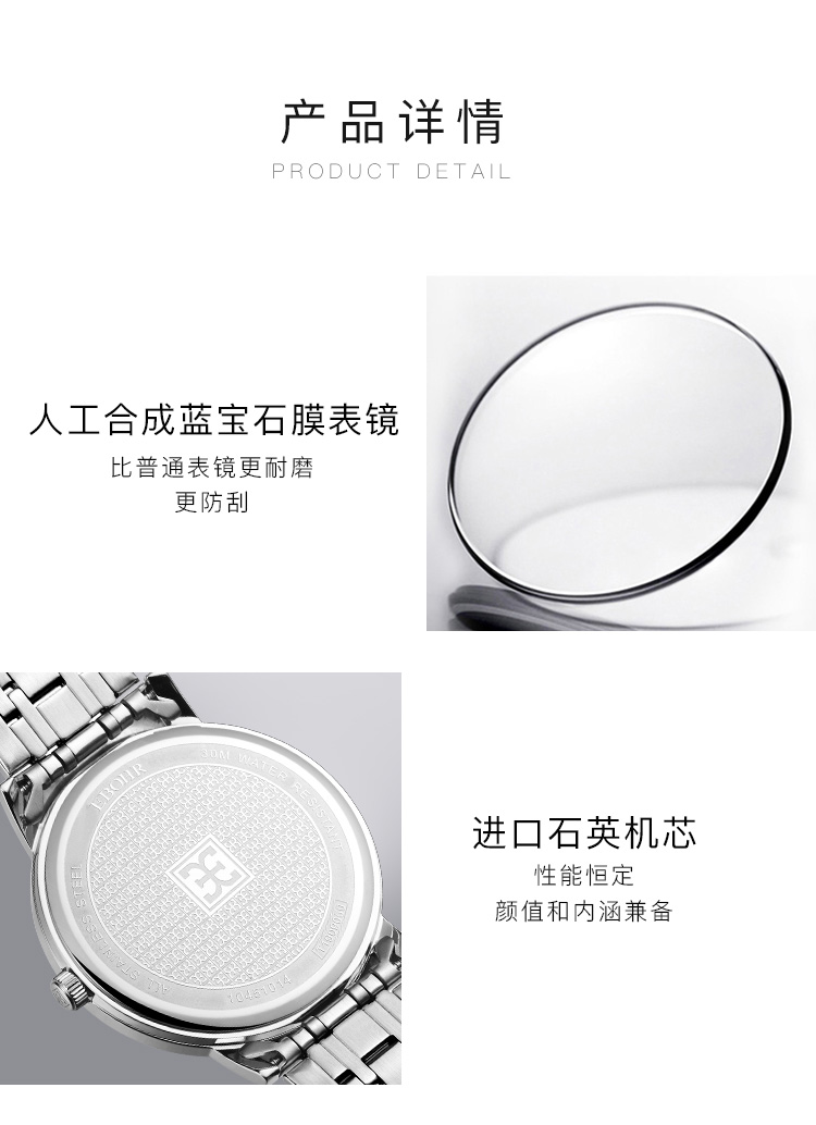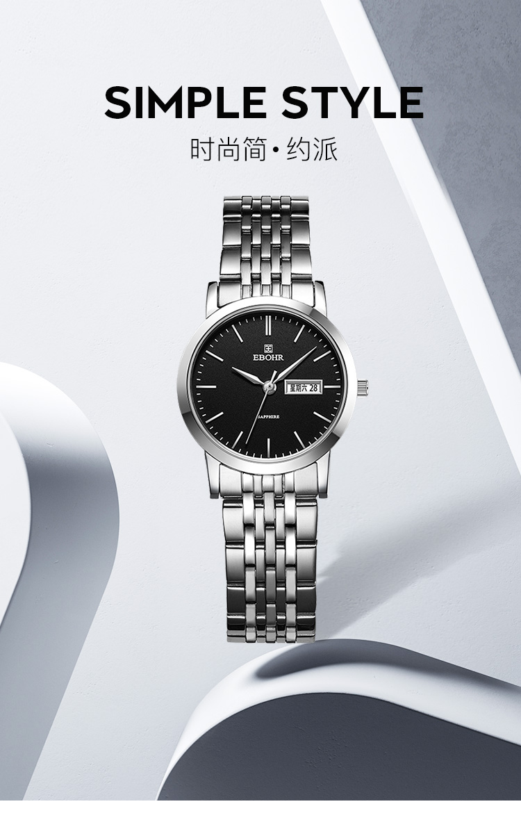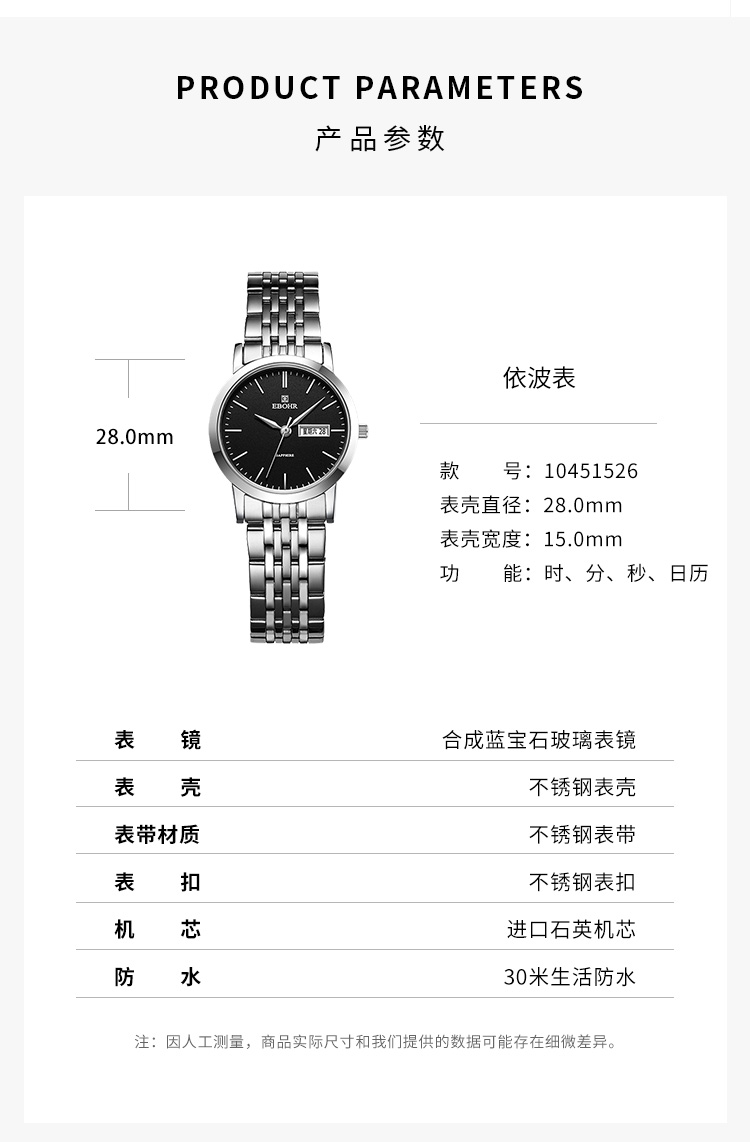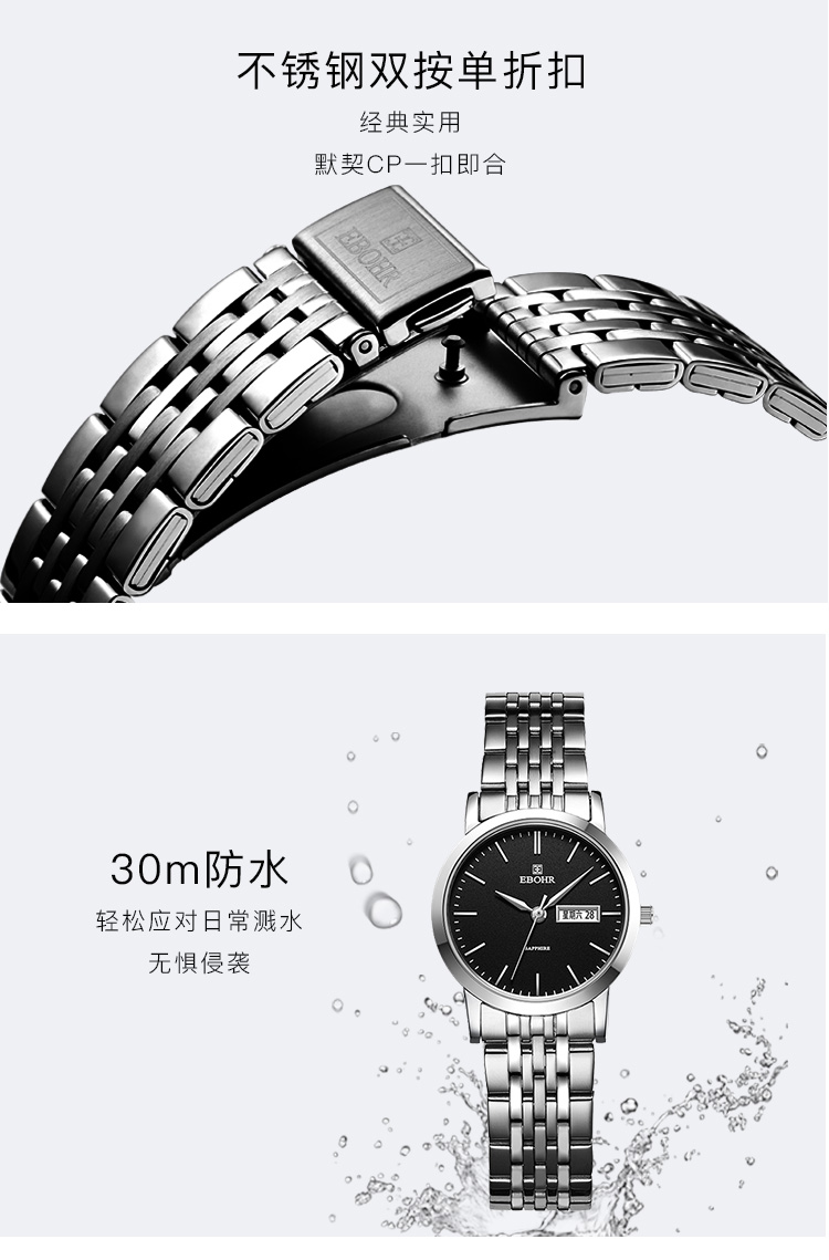 依波(EBOHR)大师系列情侣款石英表国表经典百搭双历防水手表B款 女表黑盘 10451526 曜石黑
