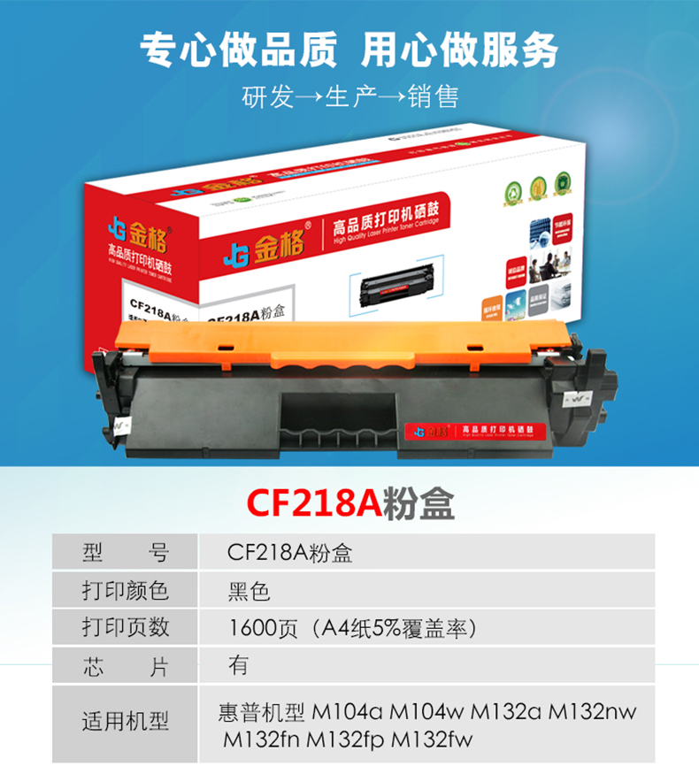 金格CF218A粉盒1支打印量1600页适用惠普m132nw m132a M104A M104W 黑色