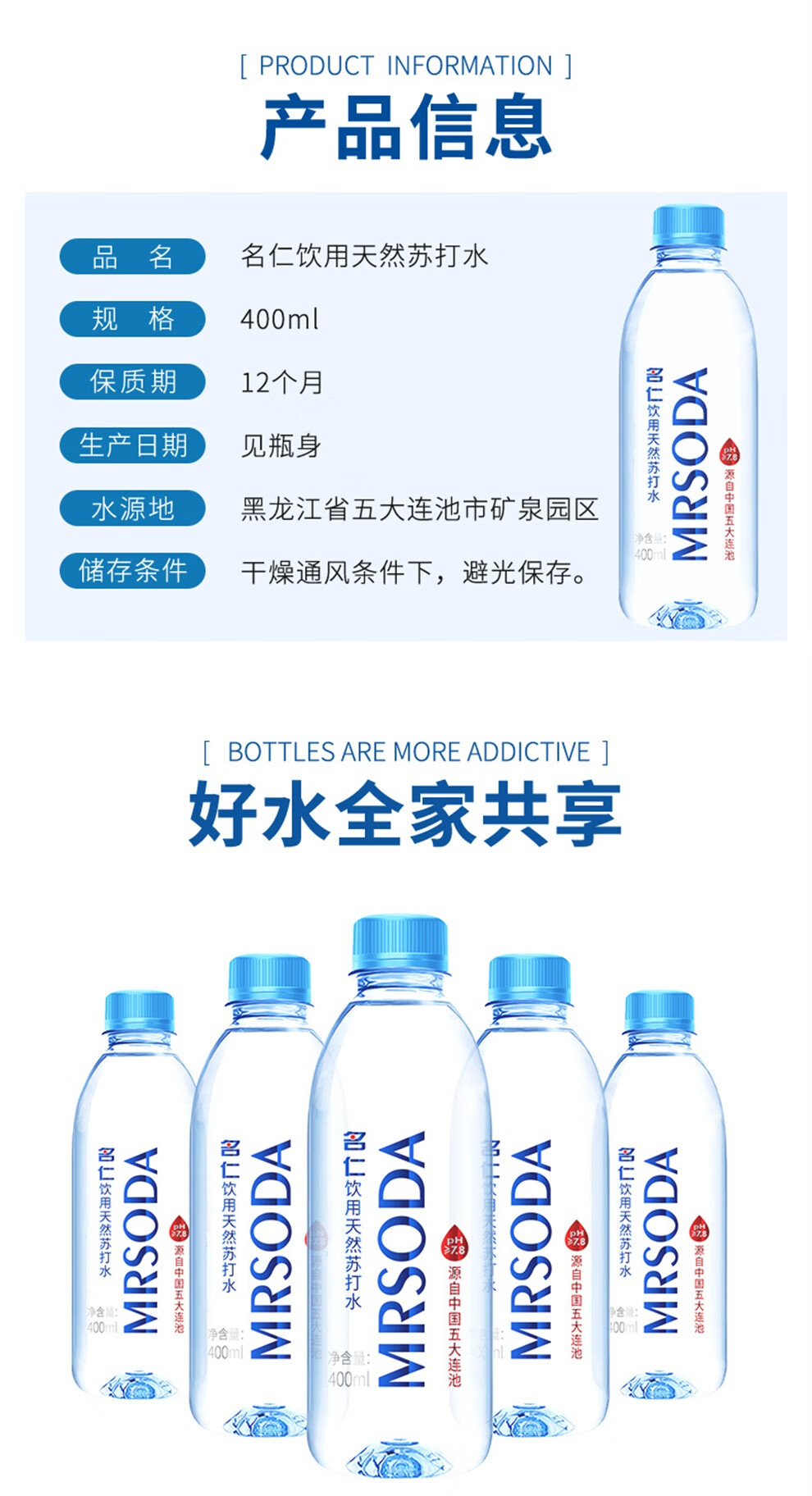 名仁(MINGREN)天然苏打水五大连池饮用水无糖无汽弱碱性明仁碱性水 400ml*24瓶整箱 白色