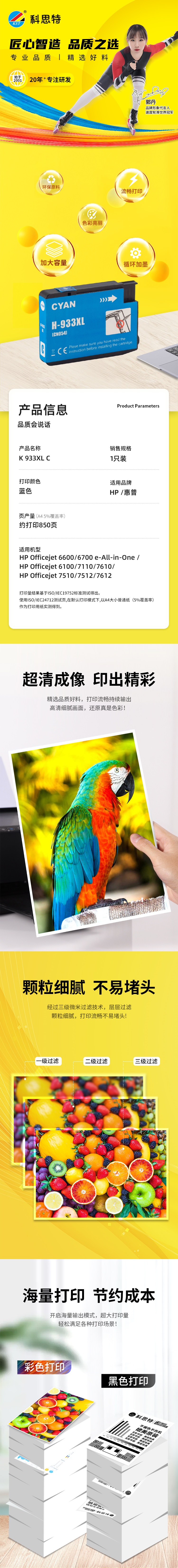 科思特 933XL C 大容量 打印量850页 适用惠普Officejet 6600 墨盒 (计价单位:盒) 青色 青色