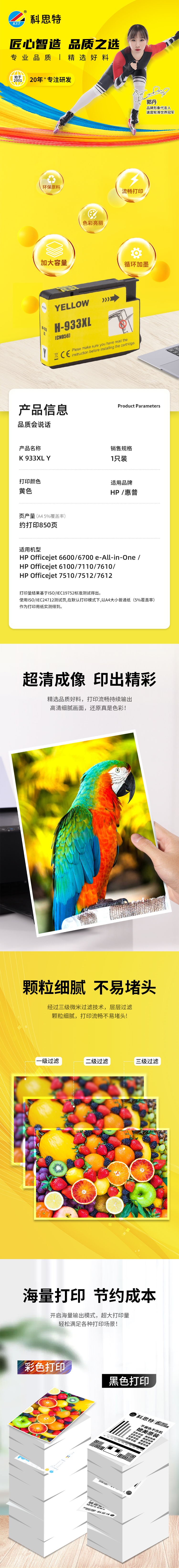 科思特 933XL Y 大容量 打印量850页 适用惠普Officejet 6600 墨盒 (计价单位:盒) 黄色 黄色
